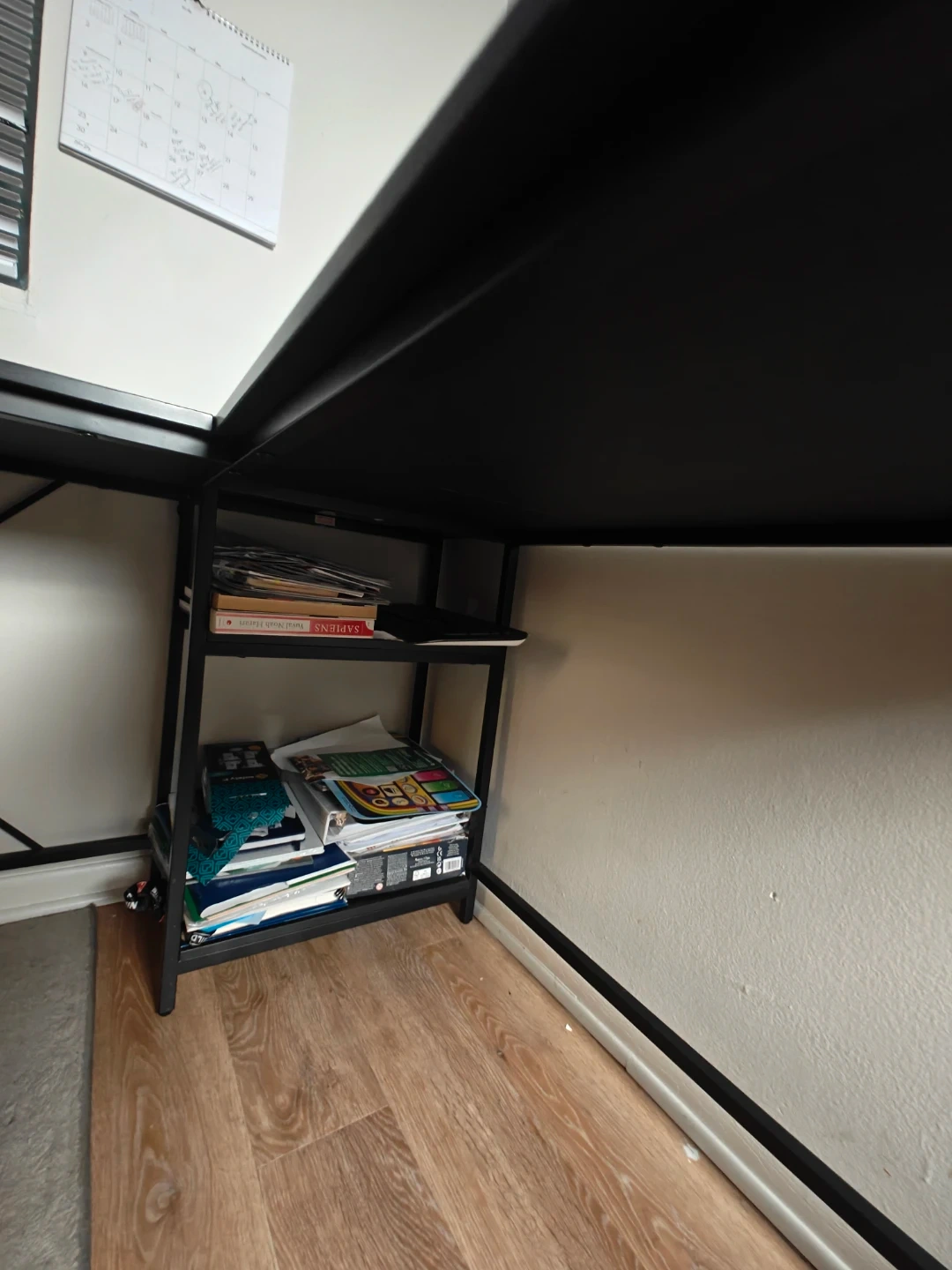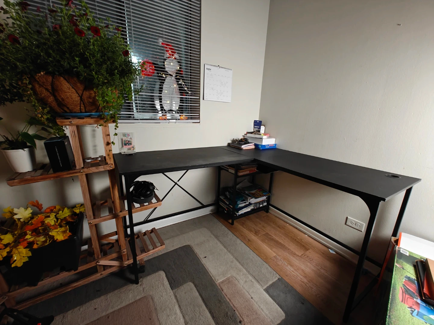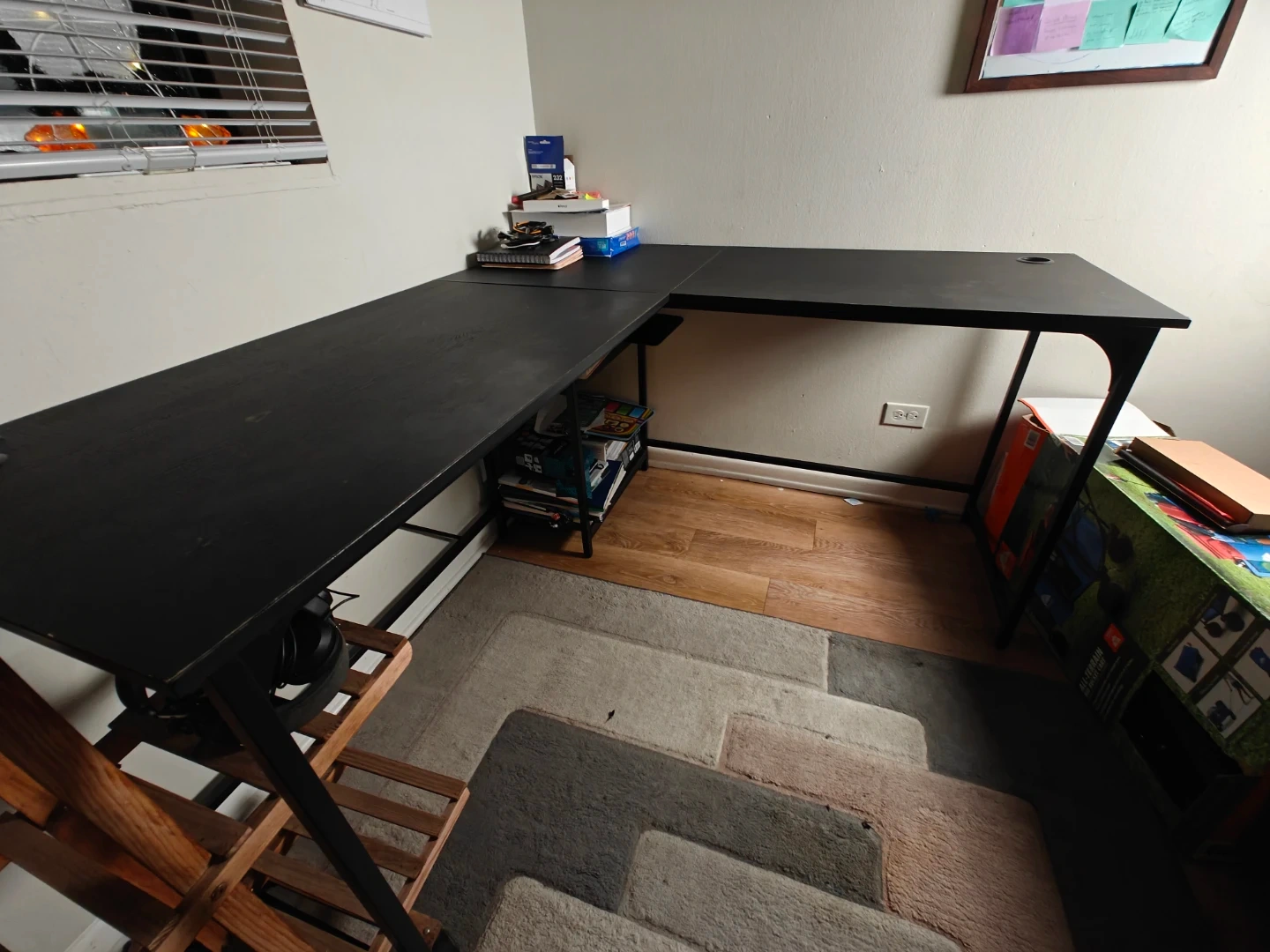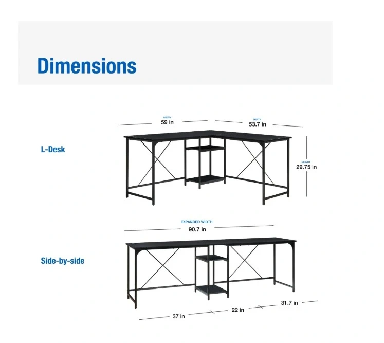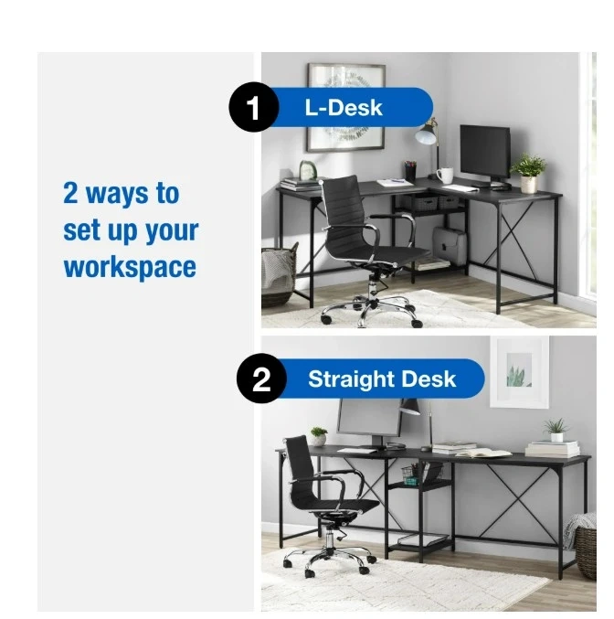 Mainstays convertible desk (L-shape or straight setup), black finish with lower shelf. Perfect for home office, studying, or small spaces. Used but in very good condition.