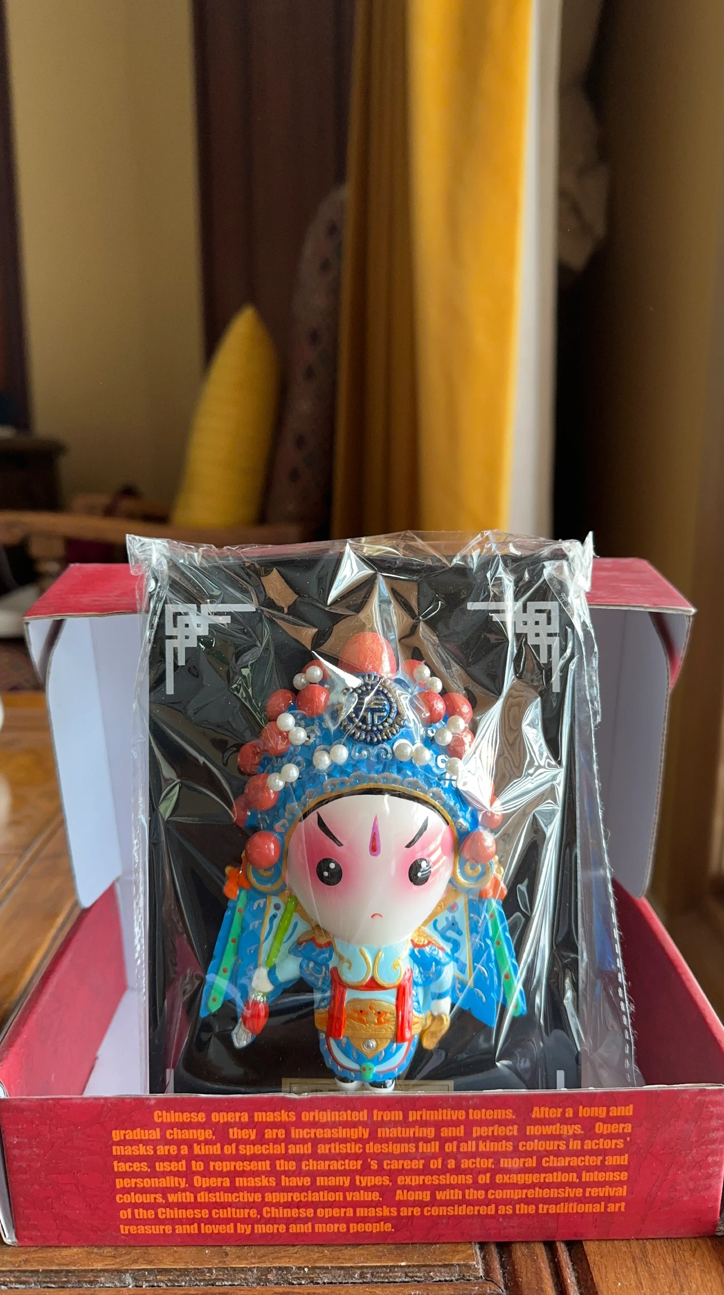 This Chinese opera mask figurine is a beautiful piece of traditional art. It's still in its original packaging and would make a lovely addition to any collection. The box describes it as a traditional art treasure loved by many people!
