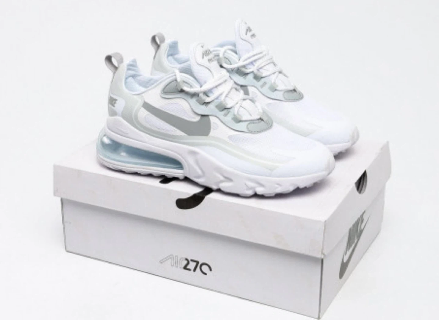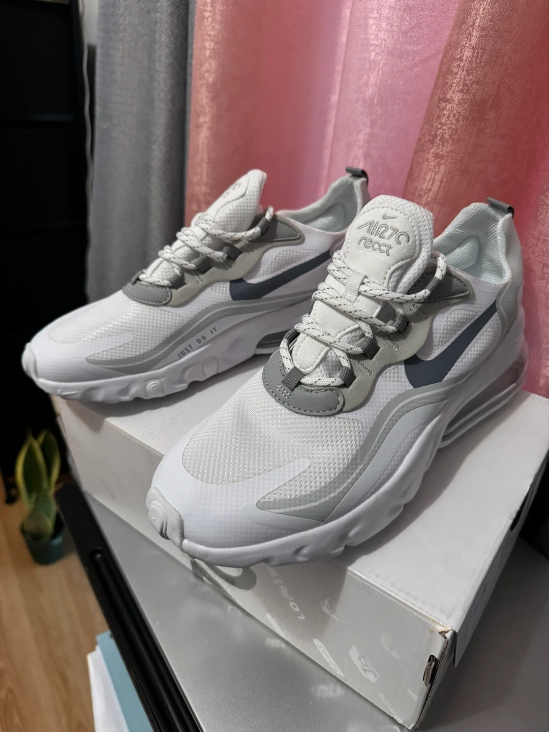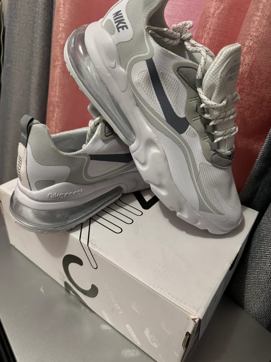 Selling a pair of Nike Air Max 270 React sneakers in white. These stylish and comfortable shoes are perfect for everyday wear or workouts. They come with the original box.