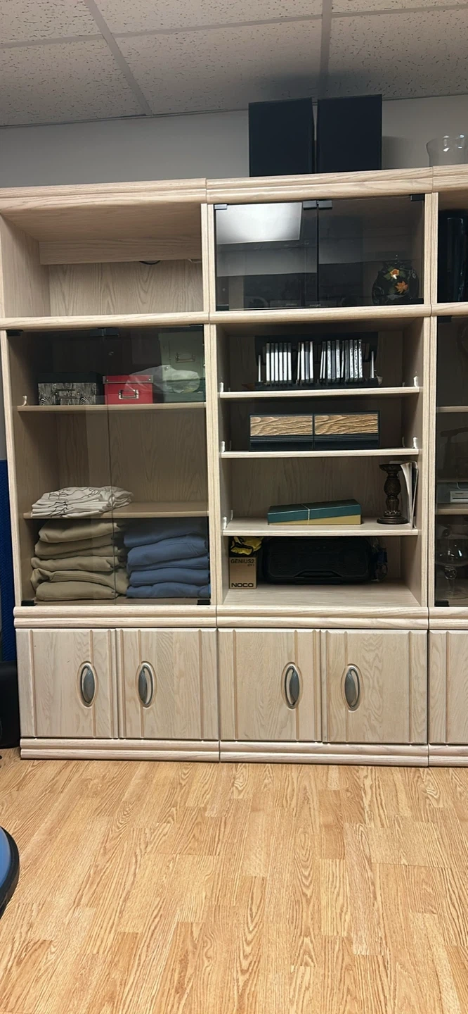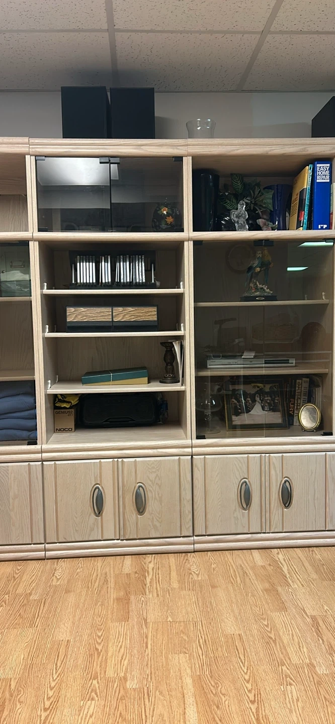 Selling a 3 piece bookcase/entertainment unit with smoked glass doors. It's in excellent shape and perfect for displaying books, decor, or storing items. It features multiple shelves and cabinet space at the bottom. There is a cutout at the back (not yet punched out) for electronic cables.