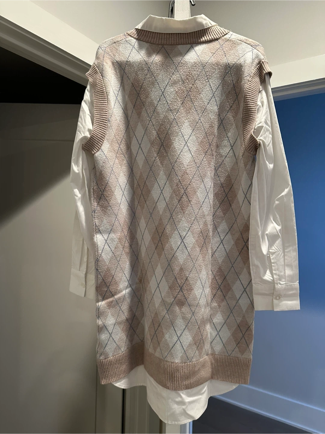 Selling a cute Max Studio sweater dress! It features a classic argyle pattern and comes in size small. Perfect for layering or wearing on its own!