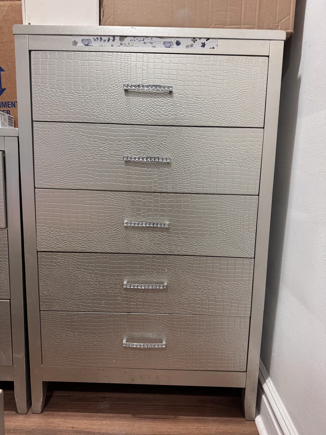 Selling a stylish silver dresser with five drawers. It features a unique embossed texture and crystal-like handles, adding a touch of elegance to any room. Perfect for organizing your clothes. I have 2 of them as a set!! Price is negotiable. Feel free to aak any questions.
