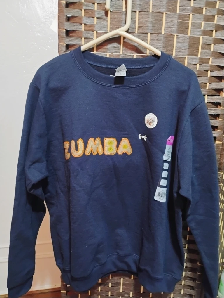 #Cleanout Zumba sweatshirt in navy blue! It's a comfy and stylish piece for your workout wardrobe. The material is soft and perfect for layering. Great for Zumba class or just lounging around!