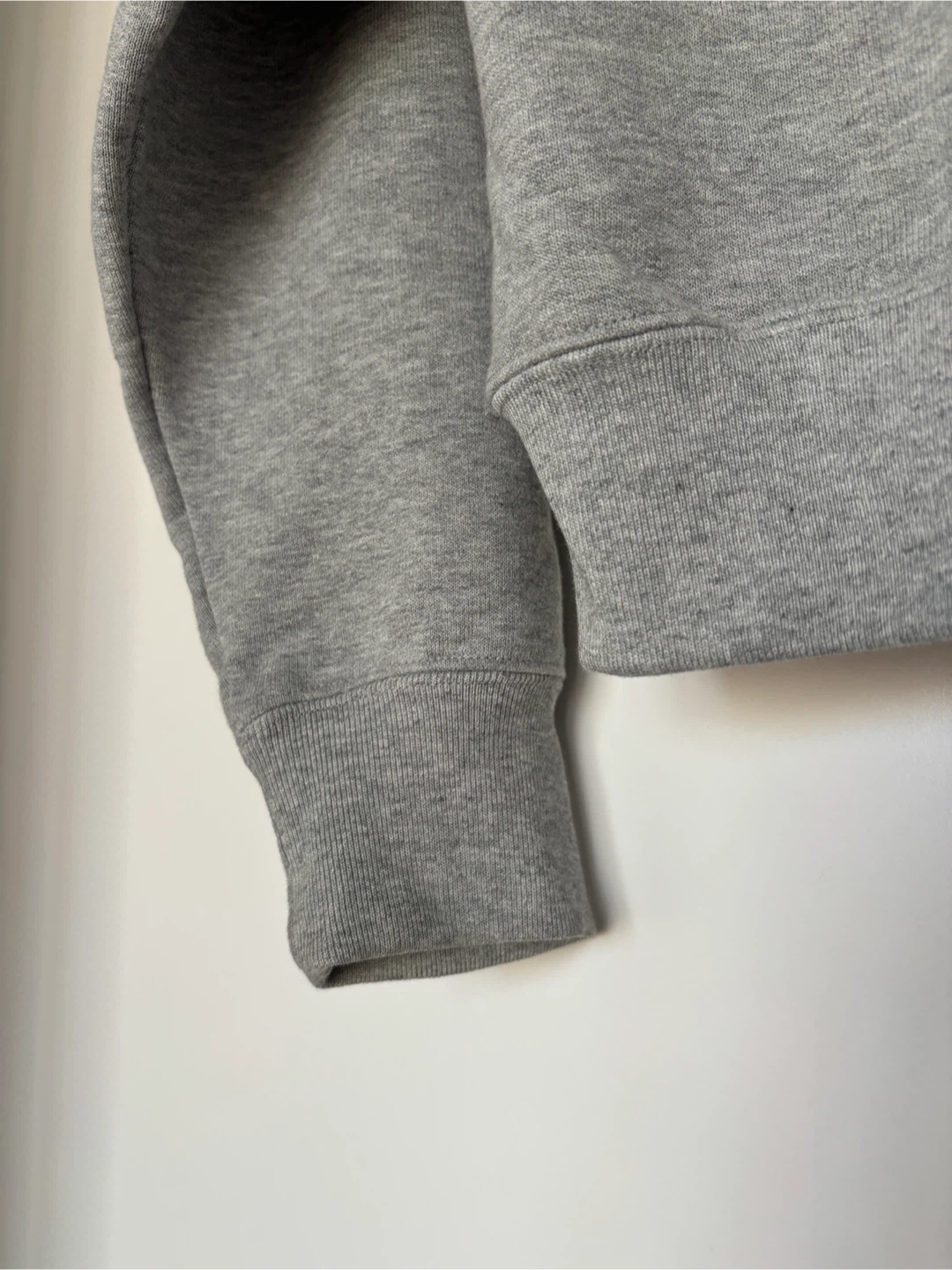 No tear but because it’s cotton, there’s some natural fading around the neckline and cuffs where the fabric folds, but nothing noticeable when wearing.