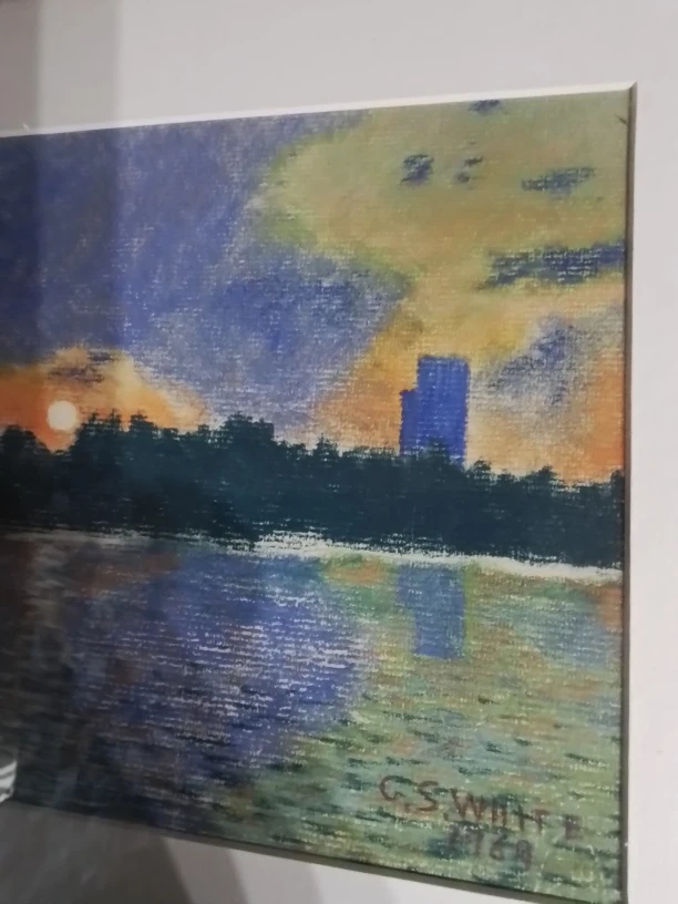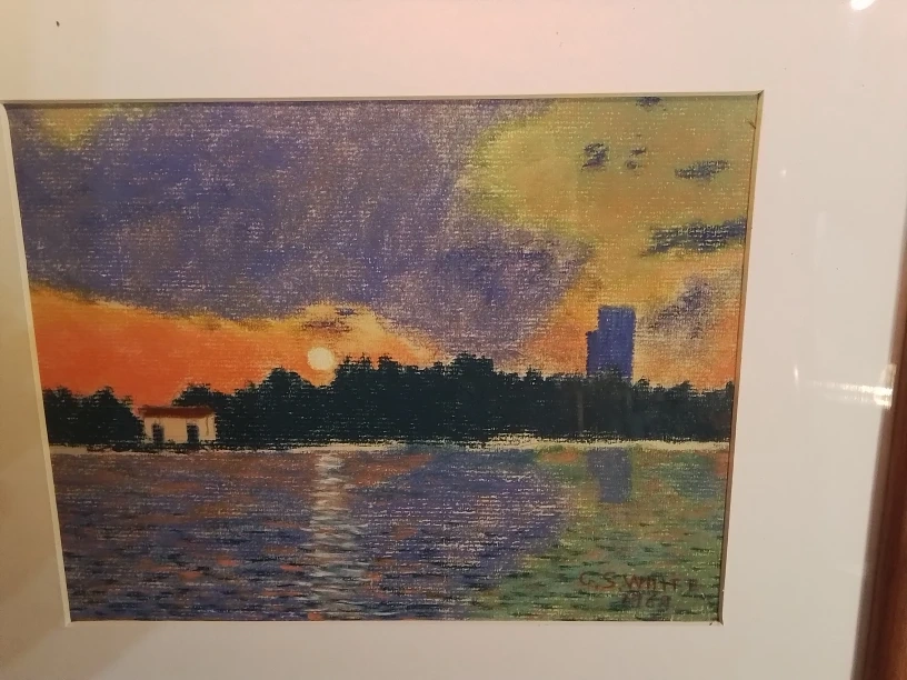 I'm offering a beautiful, original pastel painting by C.S. White, created in 1969. This framed piece measures 15.25x12.25 inches, showcasing a serene waterscape at sunset, complete with the artist's signature. The piece is in good condition considering its age, with some wear commensurate with its history, adding to its vintage charm.