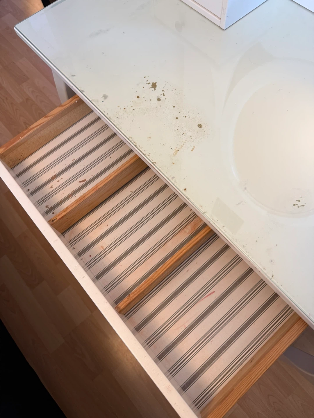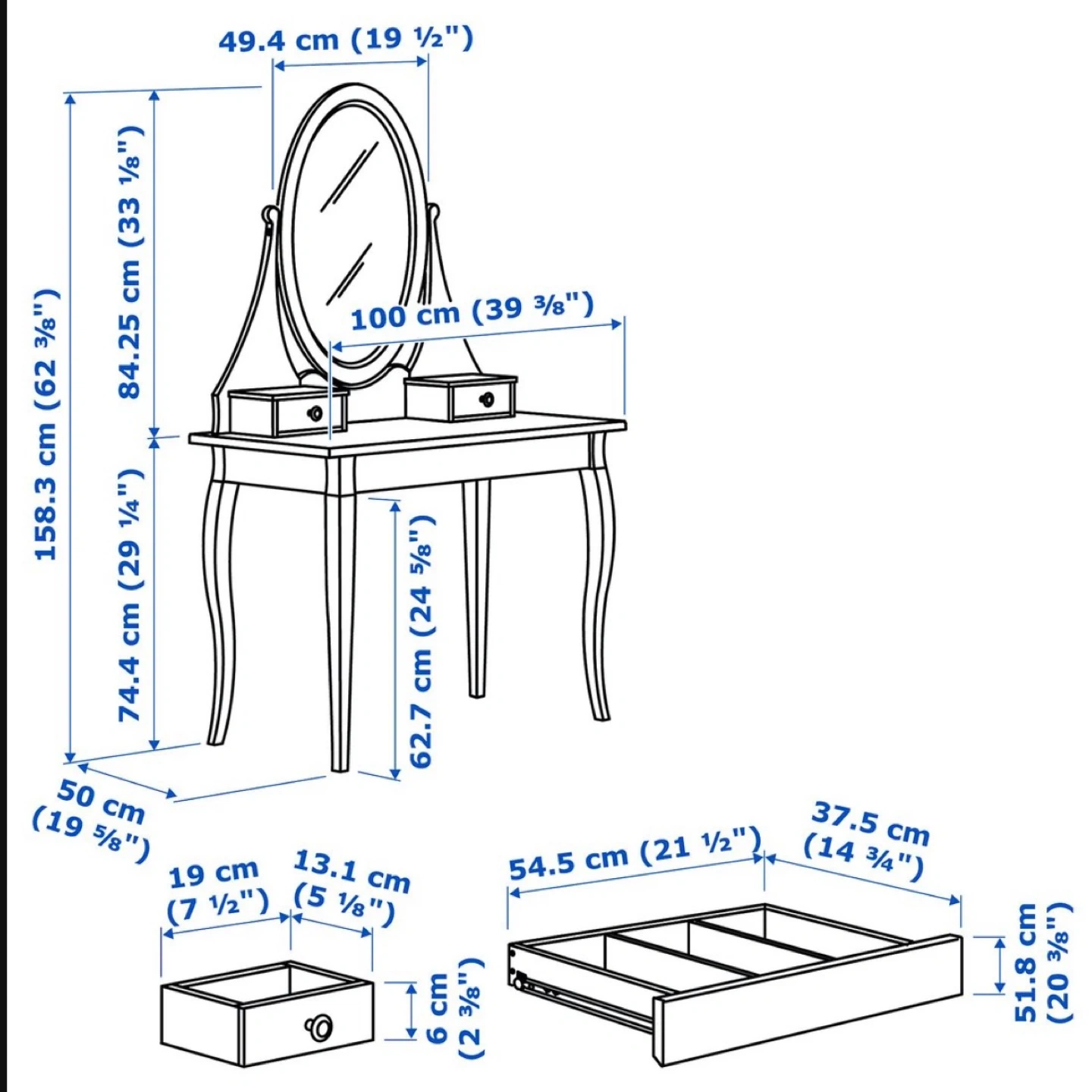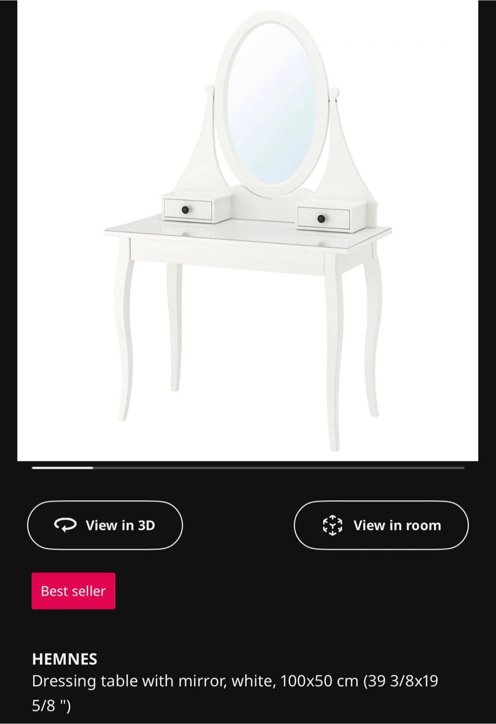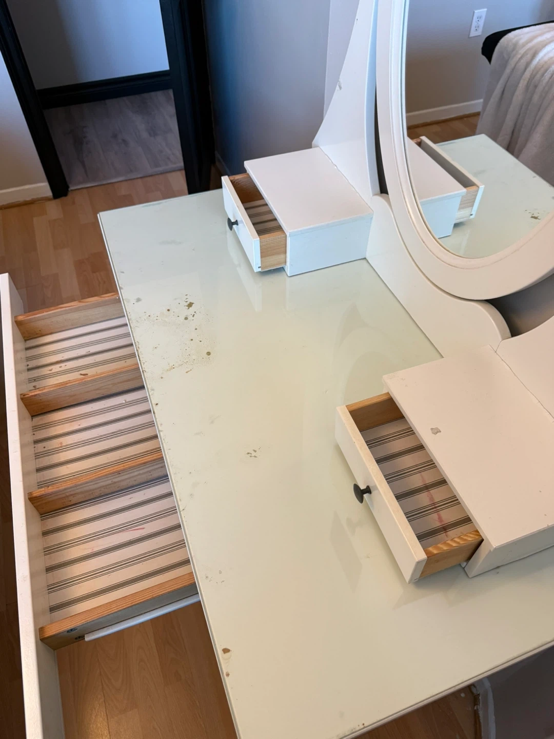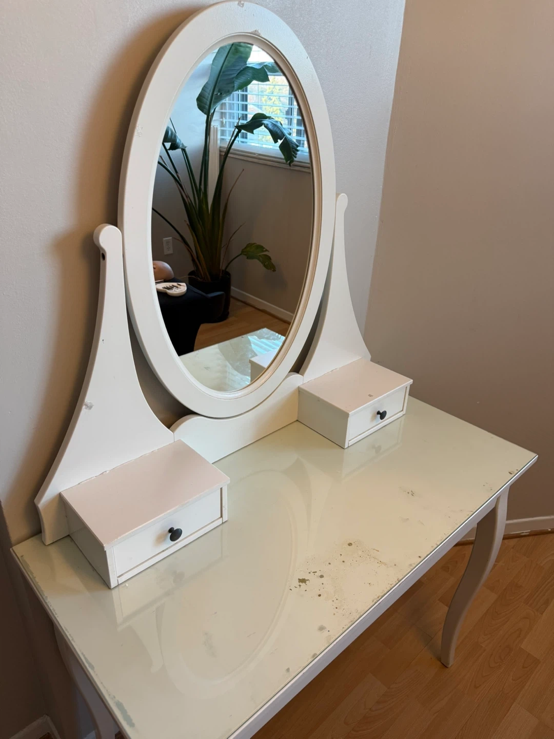 Selling a cute white vanity table with a mirror! It features an oval mirror and two small drawers. There are some signs of wear on the glass top, but it's still a functional and charming piece for any bedroom or dressing area