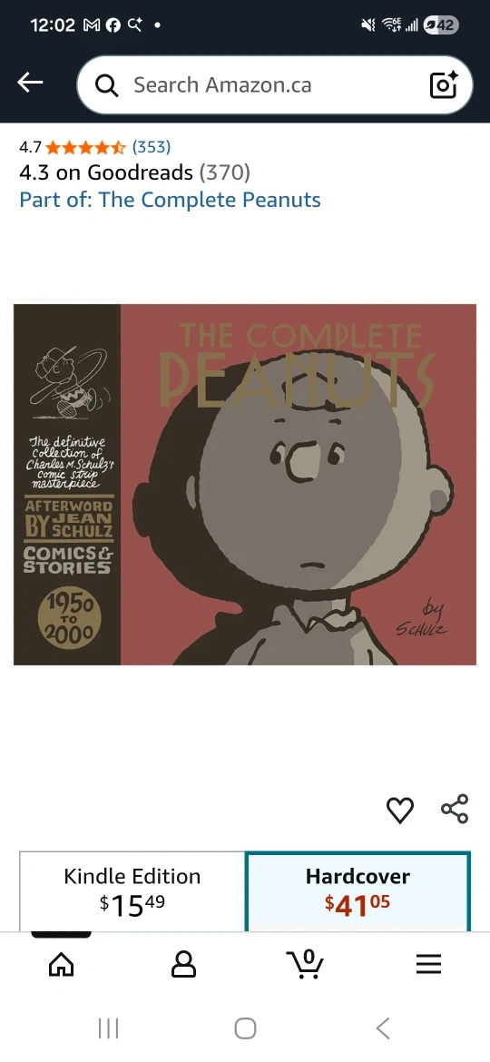 Buy & SellThe Complete Peanuts 1950-2000 HardcoverThe Complete Peanuts 1950-2000 Hardcover$24Selling a hardcover copy of The Complete Peanuts comics from 1950 to 2000. It's part of The Complete Peanuts series. Originally priced at $41.05.ConditionNewWHERE TO MEETwoodbineView MapSELLERverifiedMiaWoodbine590 reviews0 chats·0 favorites·29 viewsSEND CHAT TO SELLERHi Mia! I’m interested in your listing.Hi Mia! I’m interested in your listing.Get the Karrot app to chatSign In to chat
