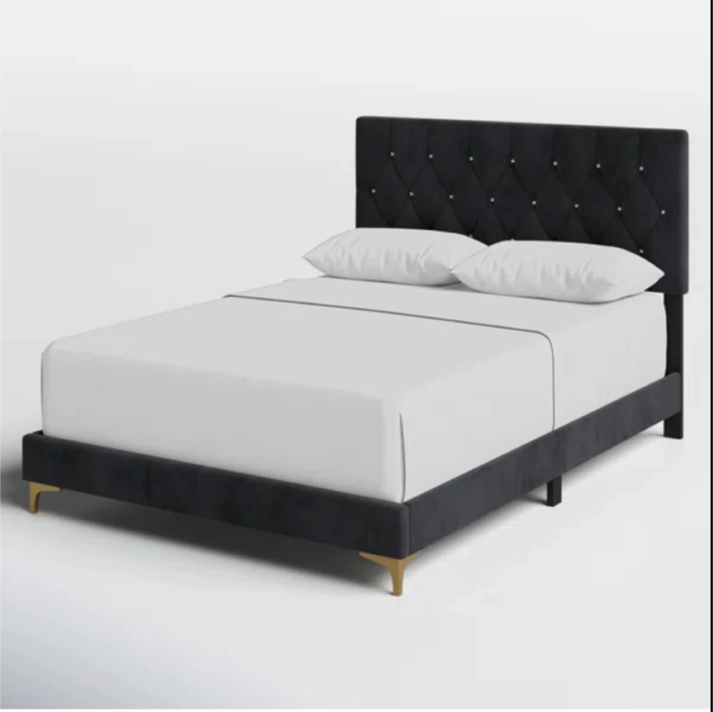 Selling a stylish upholstered bed frame. It features a sleek black finish and a tufted headboard design. The bed frame adds a touch of elegance to any bedroom decor. It's in great condition and ready for a new home!