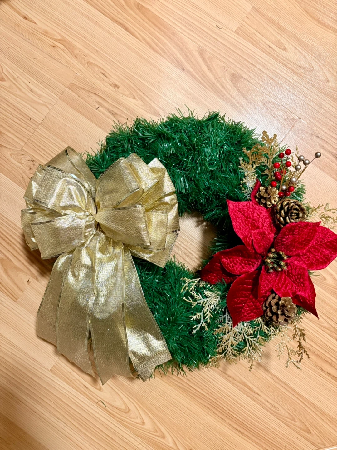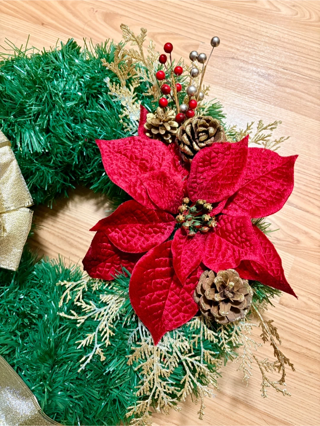 Festive Christmas wreath featuring a vibrant red poinsettia, pinecones, and a gold bow. Perfect for adding a touch of holiday cheer to your home this season