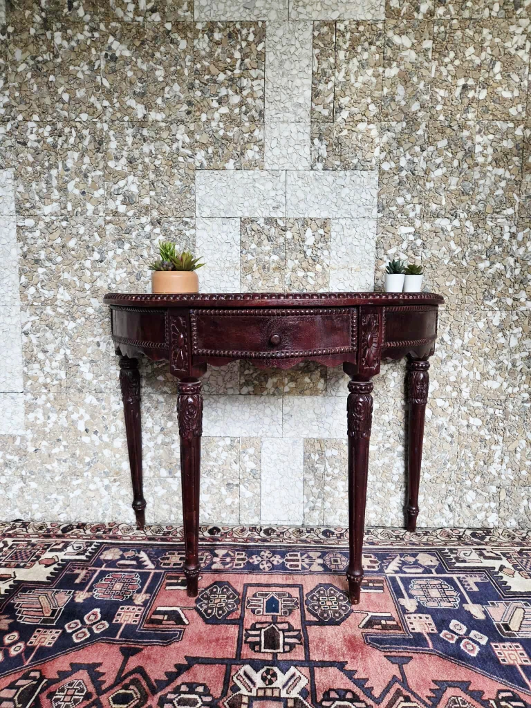 Tags: retro vintage hallway table console entryway heavily carved mahogany walnut cherry wood Half-moon curved dining room Spanish colonial