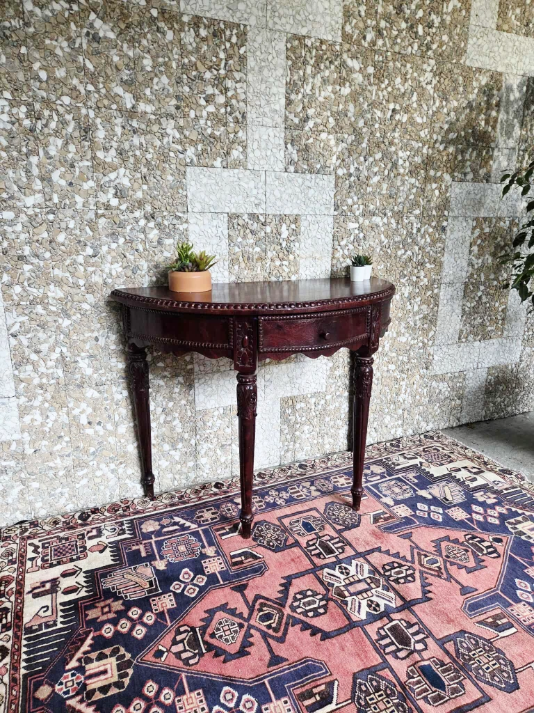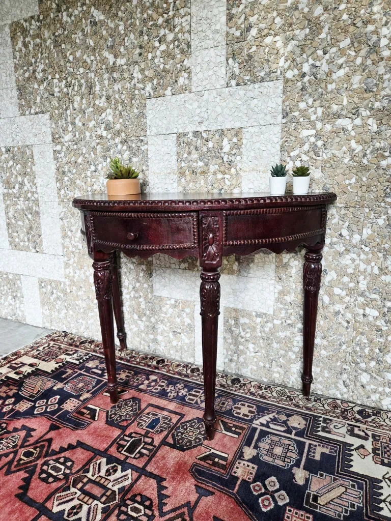 Spanish colonial style solid wood half-moon hallway table.