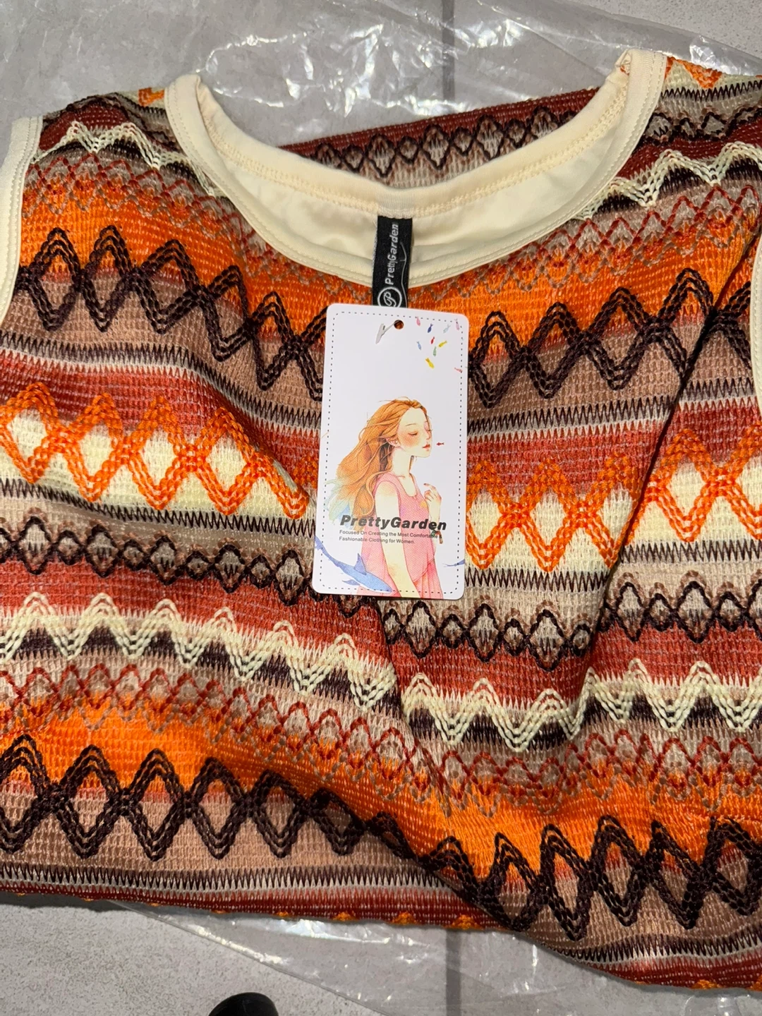 This Pretty Garden sleeveless knit dress is perfect for summer! It features a colourful geometric pattern in shades of orange, brown, and cream. It's in great condand ready for a new home!
