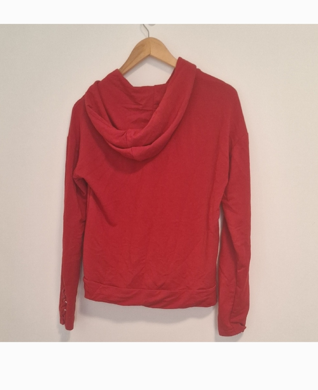 Selling a cute red hoodie from Dynamite! It's a size S and in great condition. The hoodie has a zipper and unique detailing on the sleeves. Perfect for layering or wearing on its own