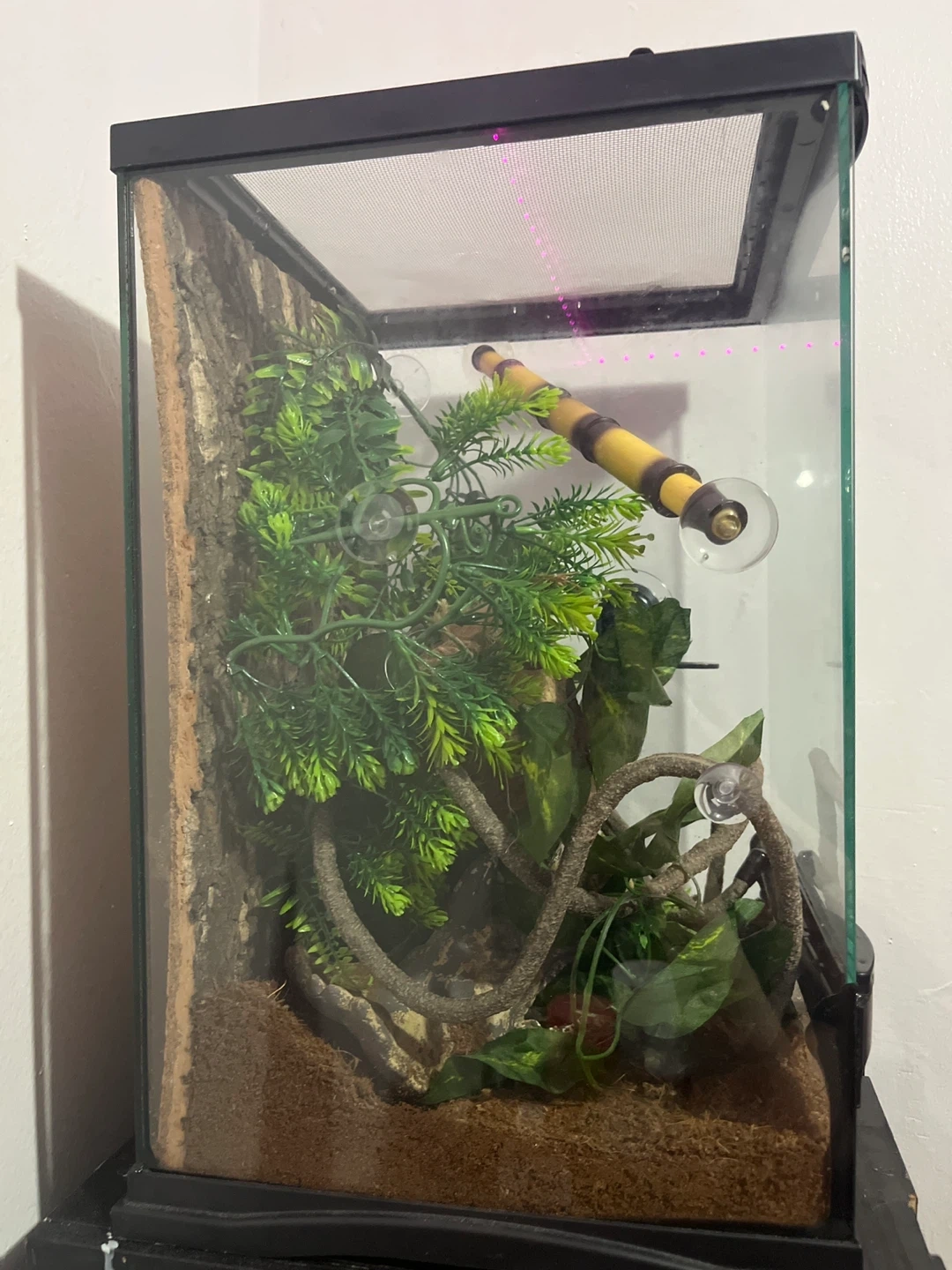 Selling a used 18 by 12 reptile enclosure terrarium basically brand new It's perfect for creating a comfortable habitat It includes fake plants, a climbing branch, dinosaur fossil hide, food holder includes feeding cups as well I’ll be giving a half a block of coco dirt. Also includes wooded background for reptile comfortability No cracks or anything on the tank thank you. PICK UP ONLY.