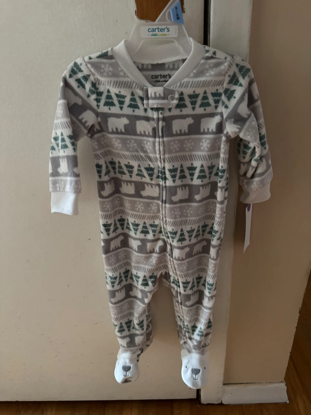Cozy Carter's fleece footed pajamas! These pajamas feature a cute pattern with polar bears and Christmas trees. Perfect for keeping your little one warm and snug during the colder months!