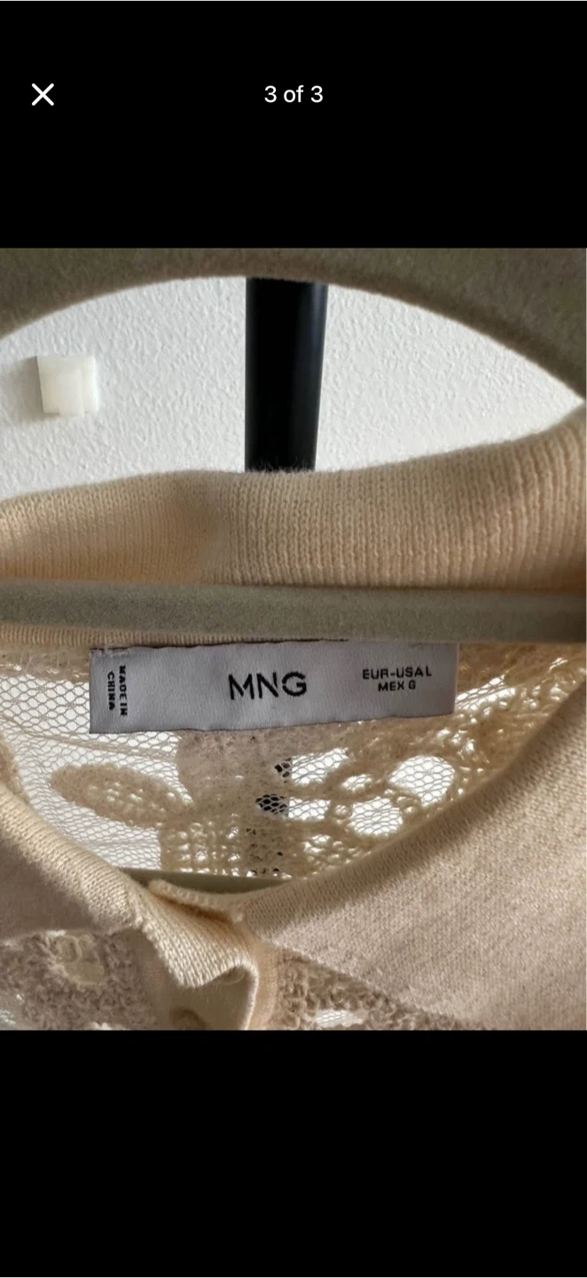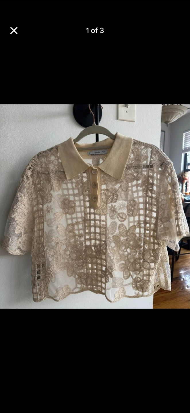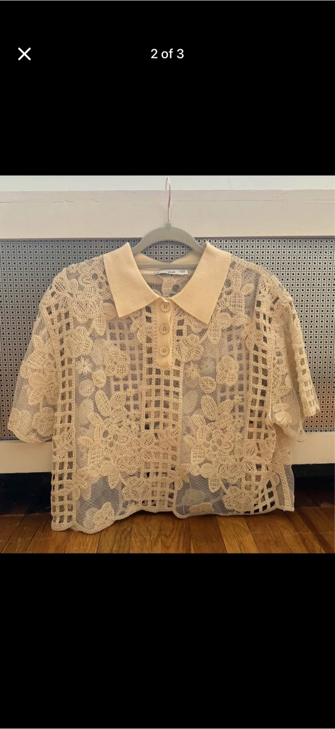 Selling a cute MNG polo shirt with a unique lace design! It's a size small and features a classic polo collar with a button-up front. The beige color is super versatile, and the lace adds a touch of elegance. Perfect for adding a stylish touch to any outfit!