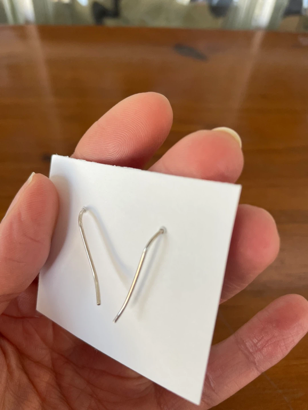 These are a pair of handmade dangle earrings. They feature a light blue bead with a unique design. They're perfect for adding a pop of colour to any outfit!