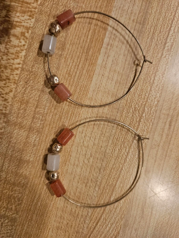 Here are a pair of hoop earrings. They are silver and have orange, white, and silver beads on them. They are in good condition!