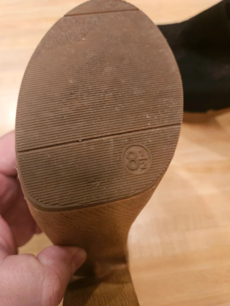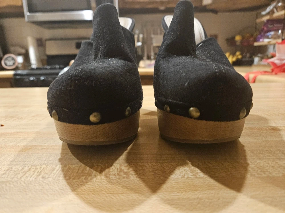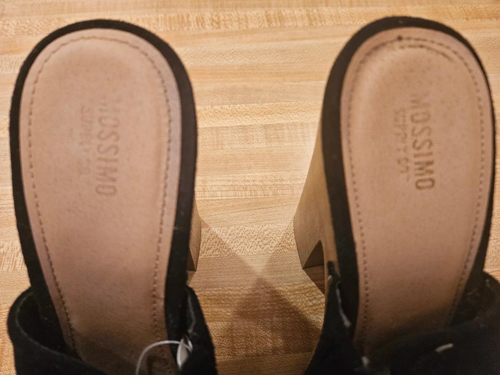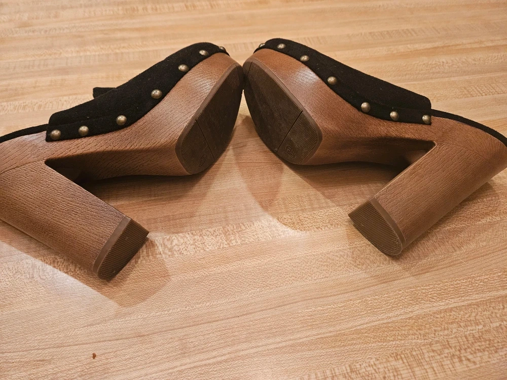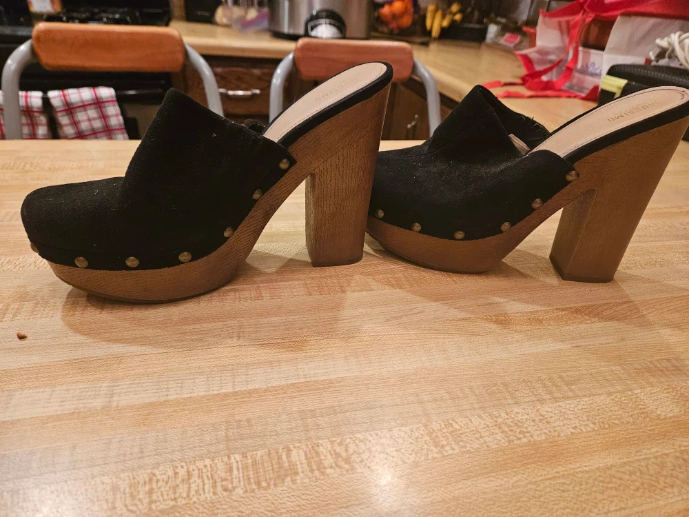 These are a pair of black clogs from Mossimo Supply Co. They feature a wooden heel and platform, and the size is 8.5 US. They are in good condition!