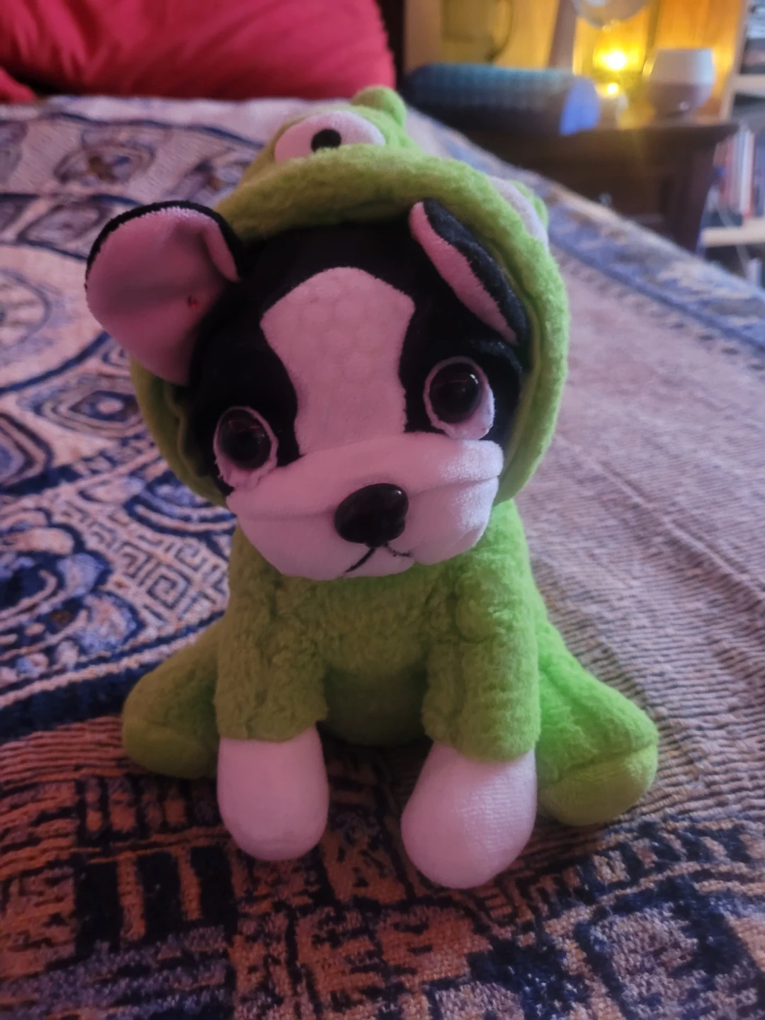 I'm giving away a cute dog plush toy dressed in a green frog costume! It's in great condition and would make a lovely addition to any collection or a fun toy for a child
