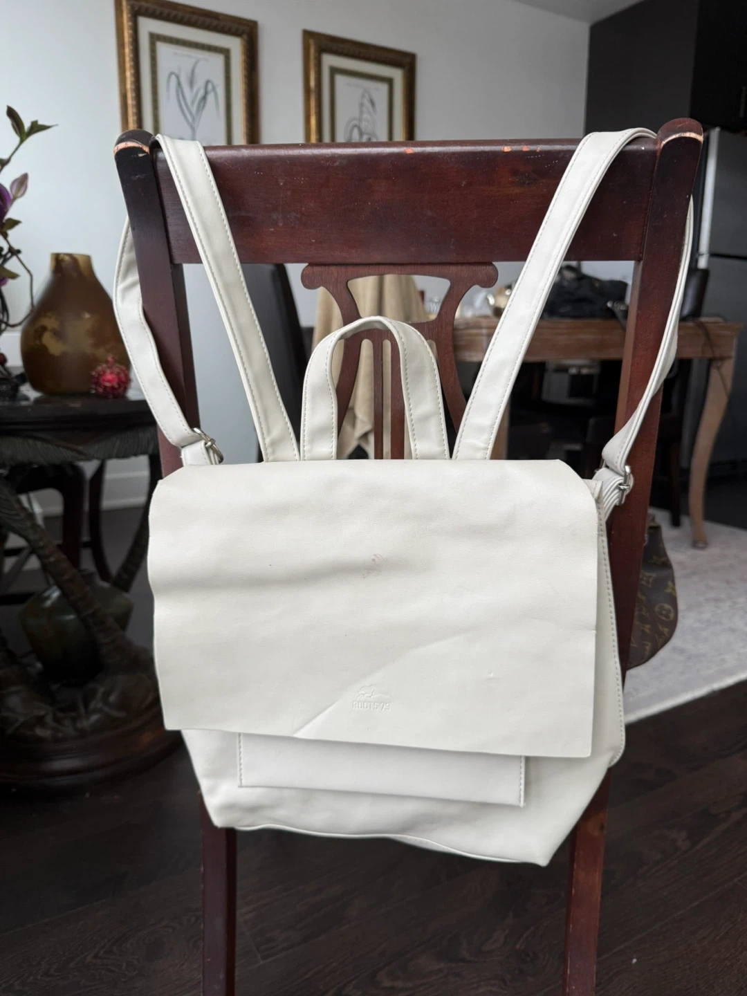 I'm selling a Roots 73 backpack in an off-white colour. It's in great condition and ready for a new owner! It has a top handle and adjustable straps.
