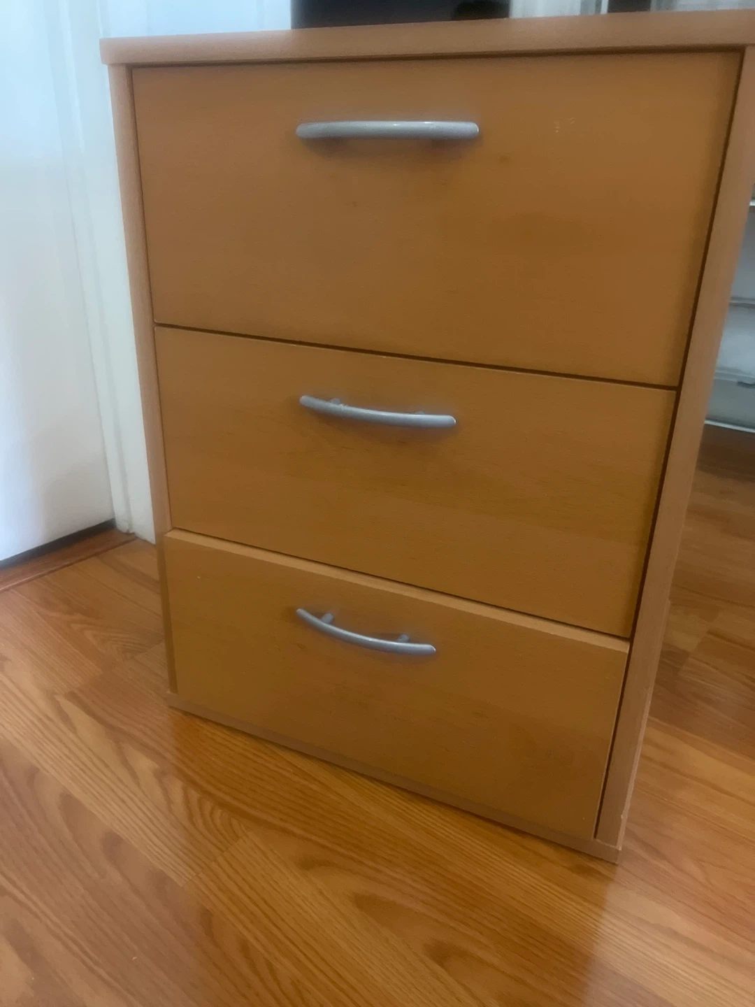 Here's a wooden three-drawer dresser! It's perfect for adding some extra storage to any room. The drawers slide smoothly and the neutral colour will match most decor styles