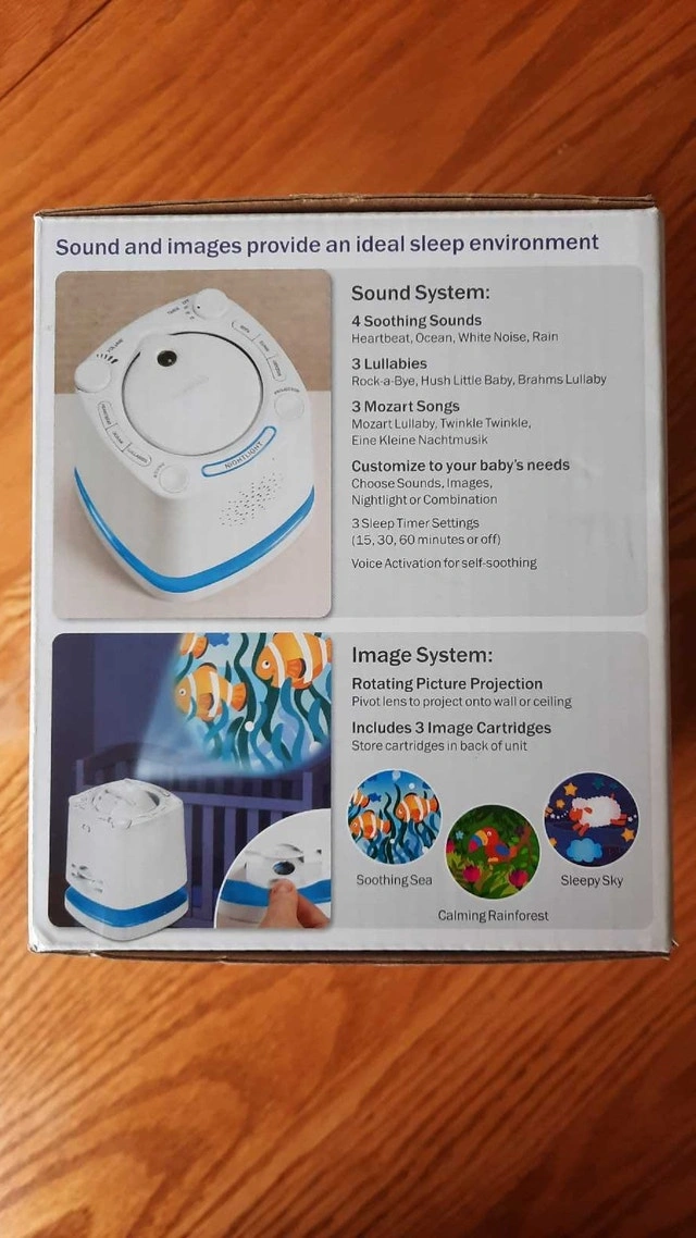 Create a soothing sleep environment for your little one with this Munchkin Nursery Projector and Sound System. This gently used device features three dreamy image cartridges, ten soft sounds, and a nightlight, all designed to help your baby drift off to sleep. It's voice-activated for convenience. Specifications: * Sound System: Includes 4 Soothing Sounds, 3 Lullabies, and 3 Mozart Songs * Image System: Rotating Picture Projection with 3 Image Cartridges (Soothing Sea, Sleepy Sky, Calming Rain Forest) * Customizable: Nightlight or Combination Settings * Timer: 15, 30, or 60-minute Timer Settings This adorable gadget makes bedtime a breeze!