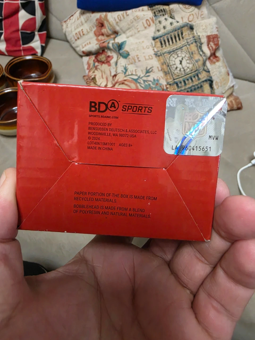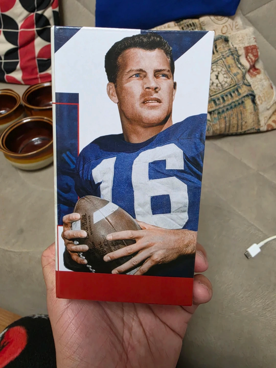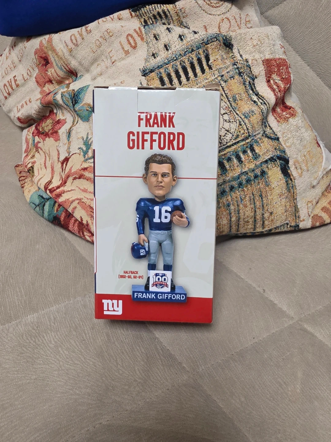 This is a Frank Gifford bobblehead from BDA Sports. It's a 2024 release and is officially licensed by the NFL. This collectible is made from a blend of polyresin and natural materials.