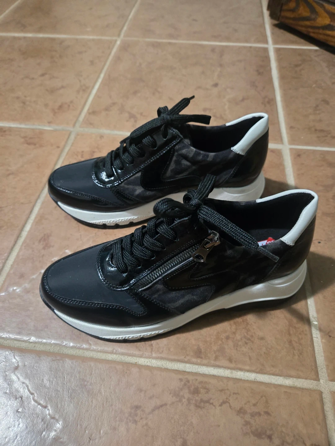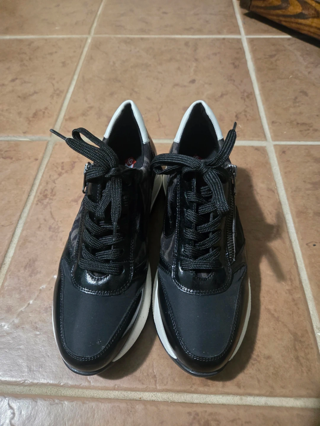 These stylish sneakers feature a black and white design with a unique side zipper accent. They have a comfortable white sole and black laces. These are perfect for casual wear or adding a fashionable touch to any outfit!