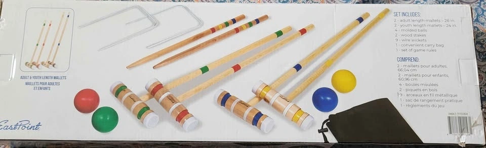 This set includes four mallets (adult and youth length), four molded balls, two wood stakes, and nine wire wickets. It also comes with a convenient carry bag for portability. Perfect for lawn game activities for all ages. Brand new item.