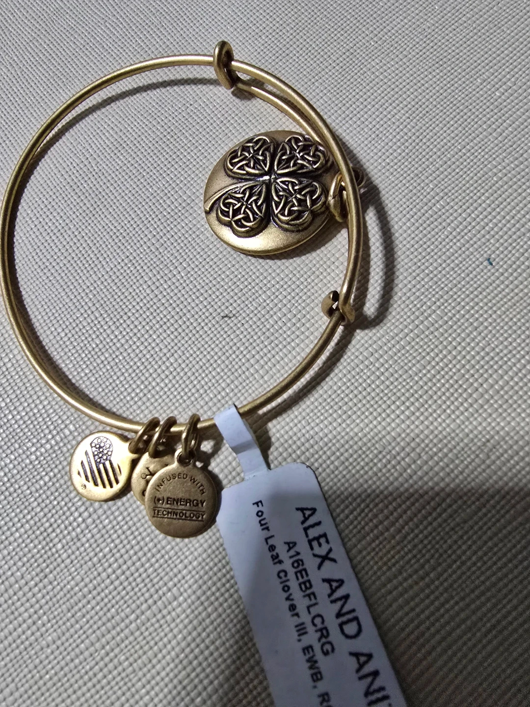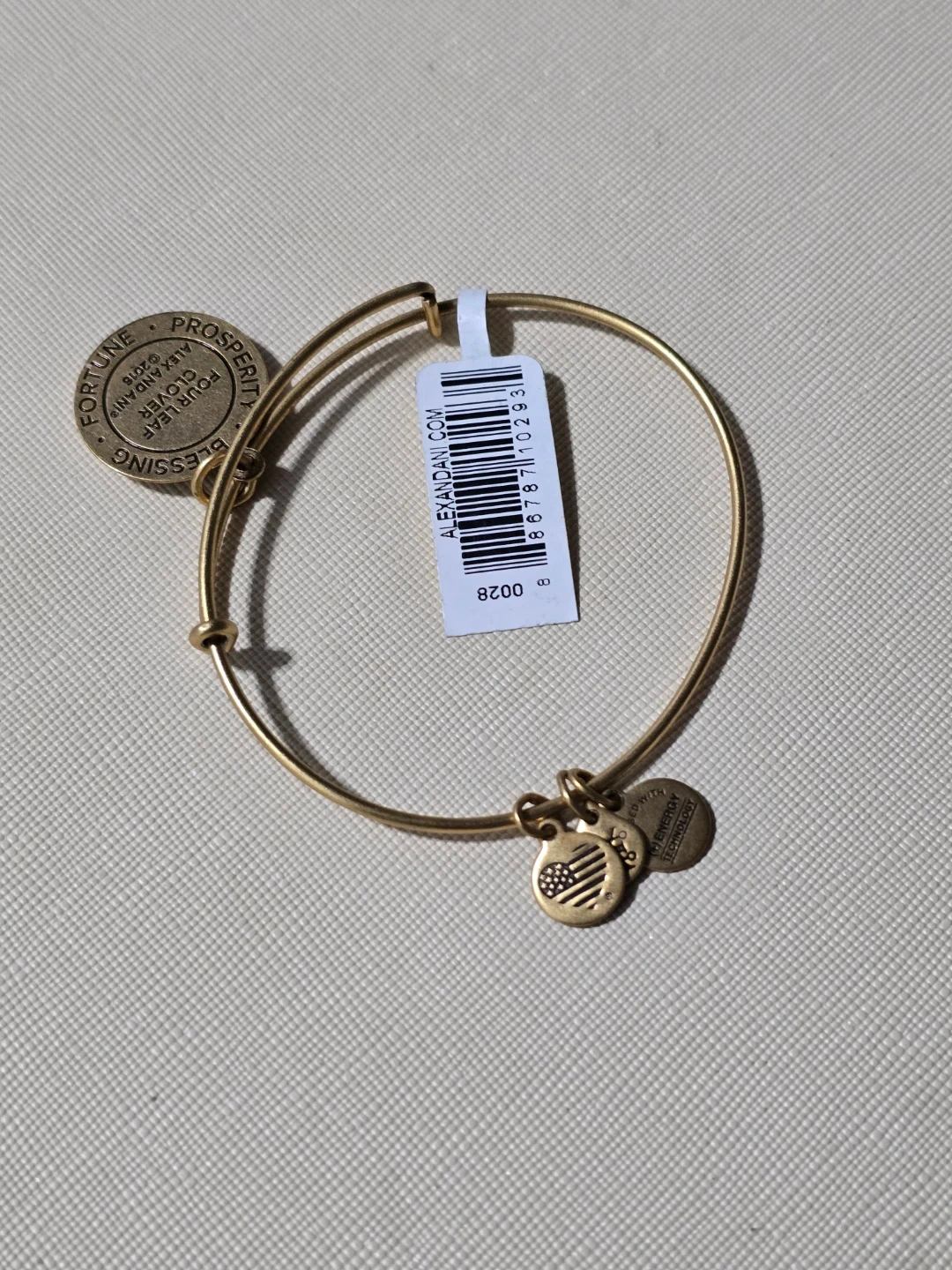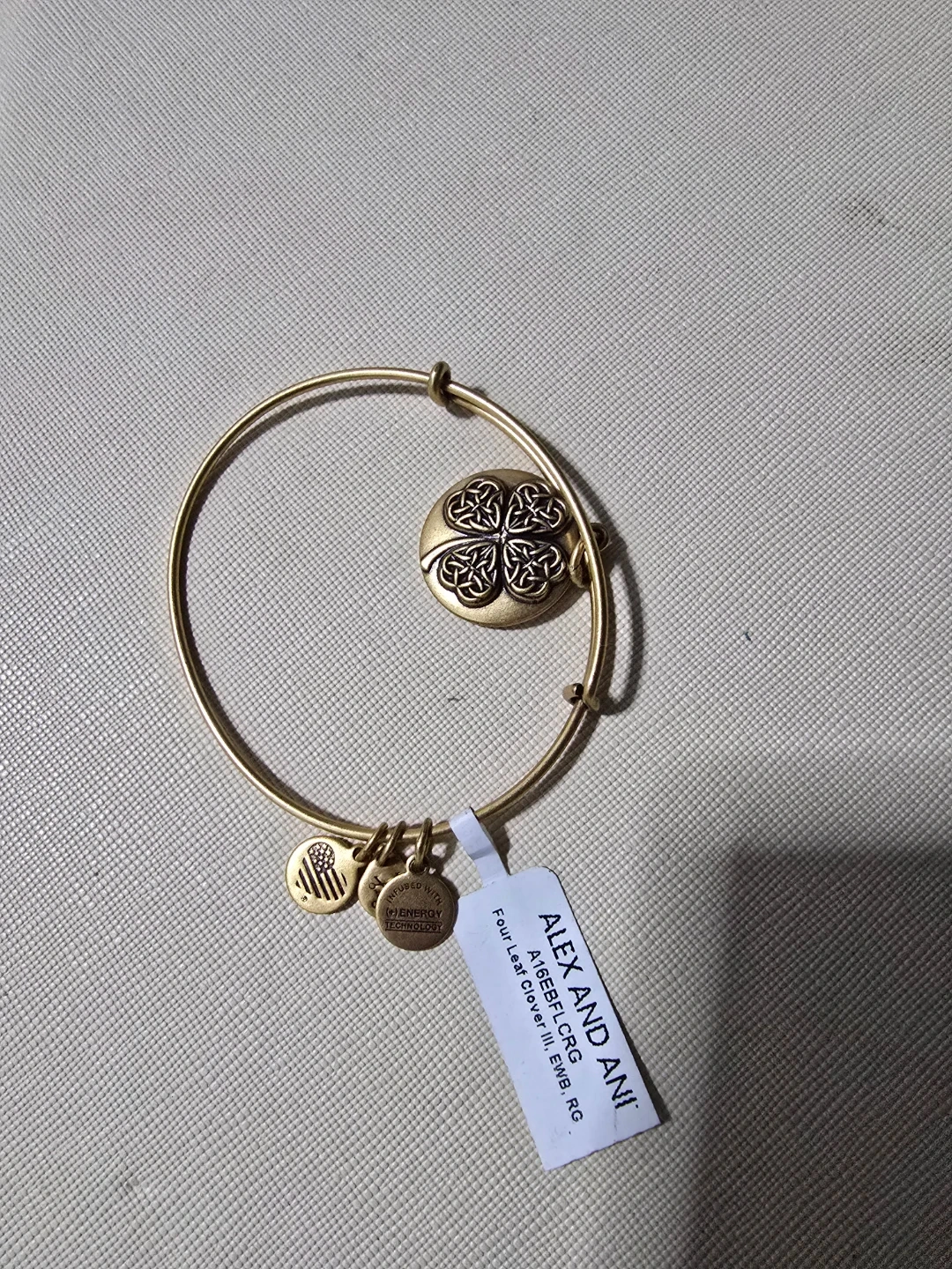 Alex and Ani bangle bracelet with a four leaf clover charm. It's crafted with a gold-tone finish and features the "Rafaelian Gold" finish. Includes original tag.