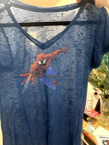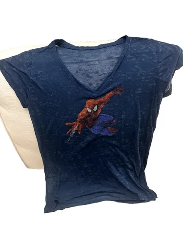 Diaphanous (see-thru) MARVELOUS Women's SPIDEY T-shirt from the Broadway Show Turn Off the Dark in Feb. 2011super soft and stretchy Women's T-shirt XL (but fits medium-large) like new - worn twice. SUPER originalMade in the United States, MARVEL merchandisePopular superhero Spiderman from the MARVEL universe, specifically designed to mimic the web-like diaphanous spider web appearance-super soft and stretchy. The shirt is part of a unique collection in the entertainment memorabilia industry, aiming to appeal to fans of the Spiderman franchise and theatrical enthusiasts. This exclusive piece is sure to stand out and be a coveted item for collectors and fans of Marvel and the web-slinger himself! Add the Collector's Playbill for $40.00 obo (total $139)