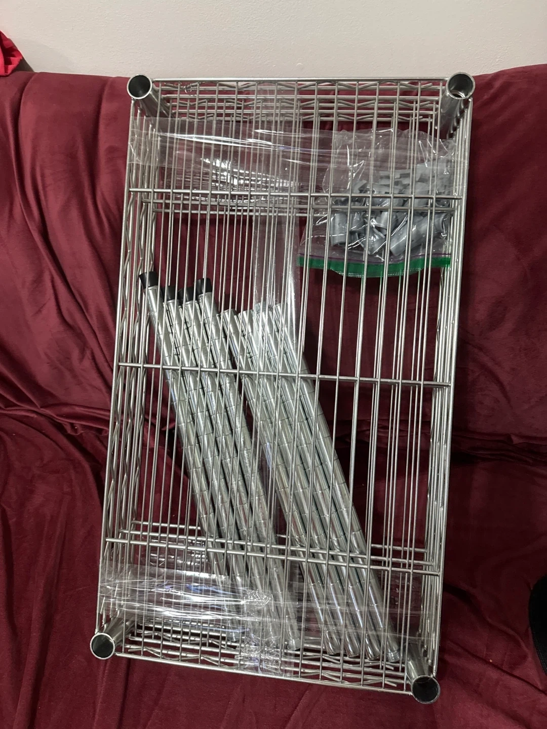 This is a new wire shelving unit. It's made of durable metal and comes with all the necessary hardware for assembly. It's great for organizing storage in garages, kitchens, or pantries.