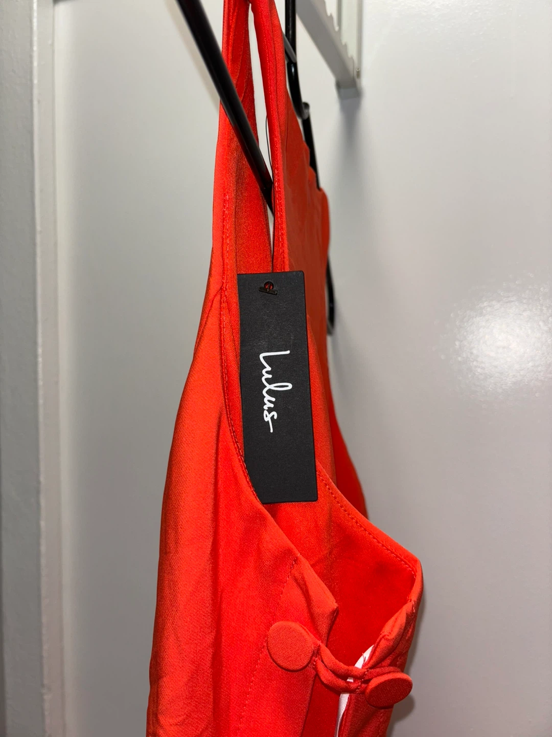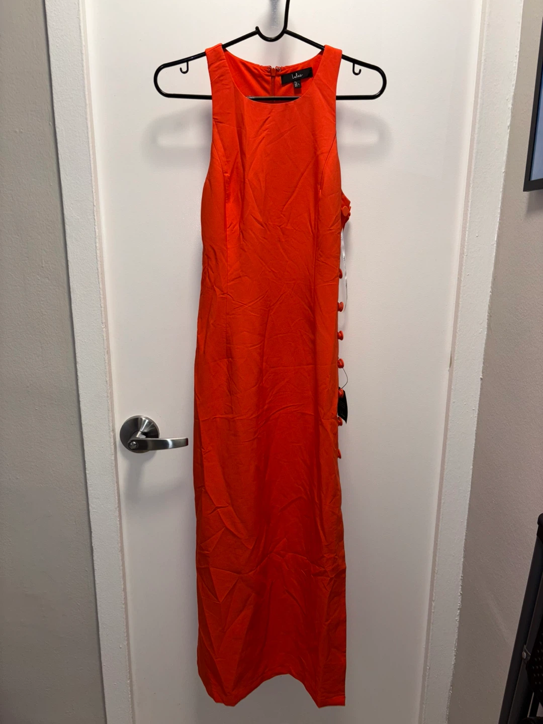 Here's a Lulus dress that's perfect for a night out! It's a beautiful orange color and features a unique button design on the side. It's sleeveless, making it great for warmer weather or layering. Brand New with tags. Retail price $89