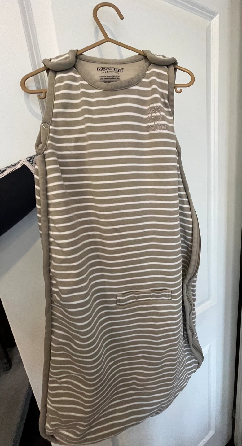 Woolino 4 Season Ultimate Baby Sleep Sack. This sleep bag is made from Merino Wool & Organic Cotton and is suitable for babies aged 2-24 months. Tiny fray on one of the inner arms, shown in photo.