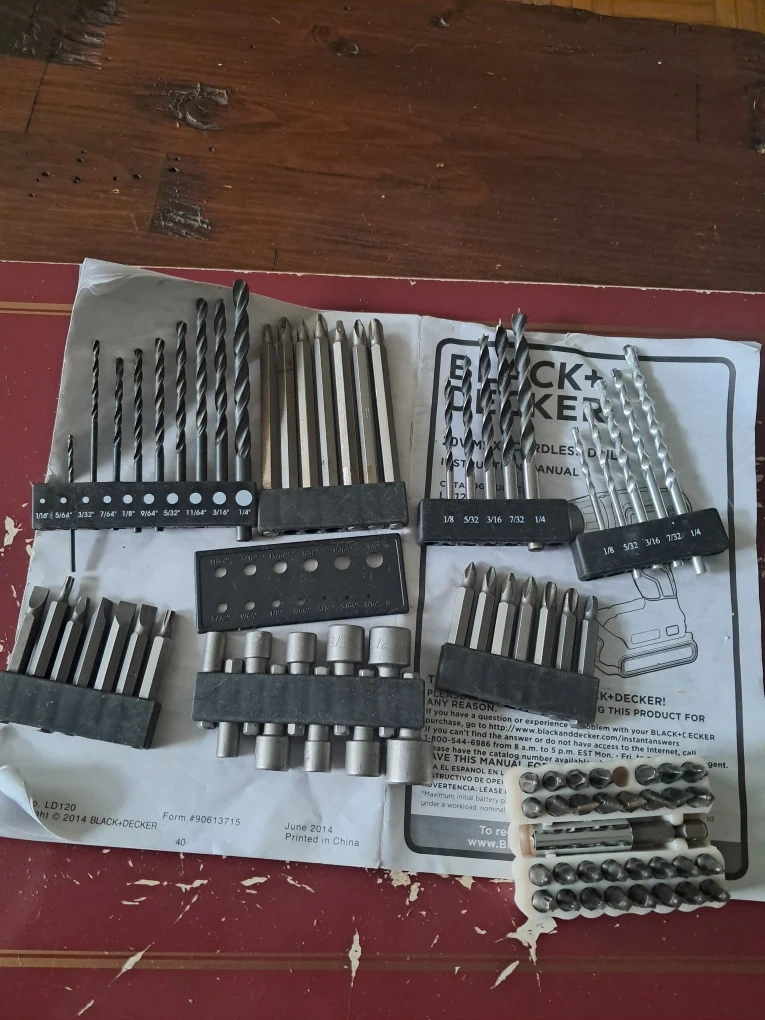 Selling a Black+Decker 20V MAX cordless drill kit. It comes with a variety of drill bits and driver bits. Also included are the battery, charger, and carrying bag! The instruction manual is also included.