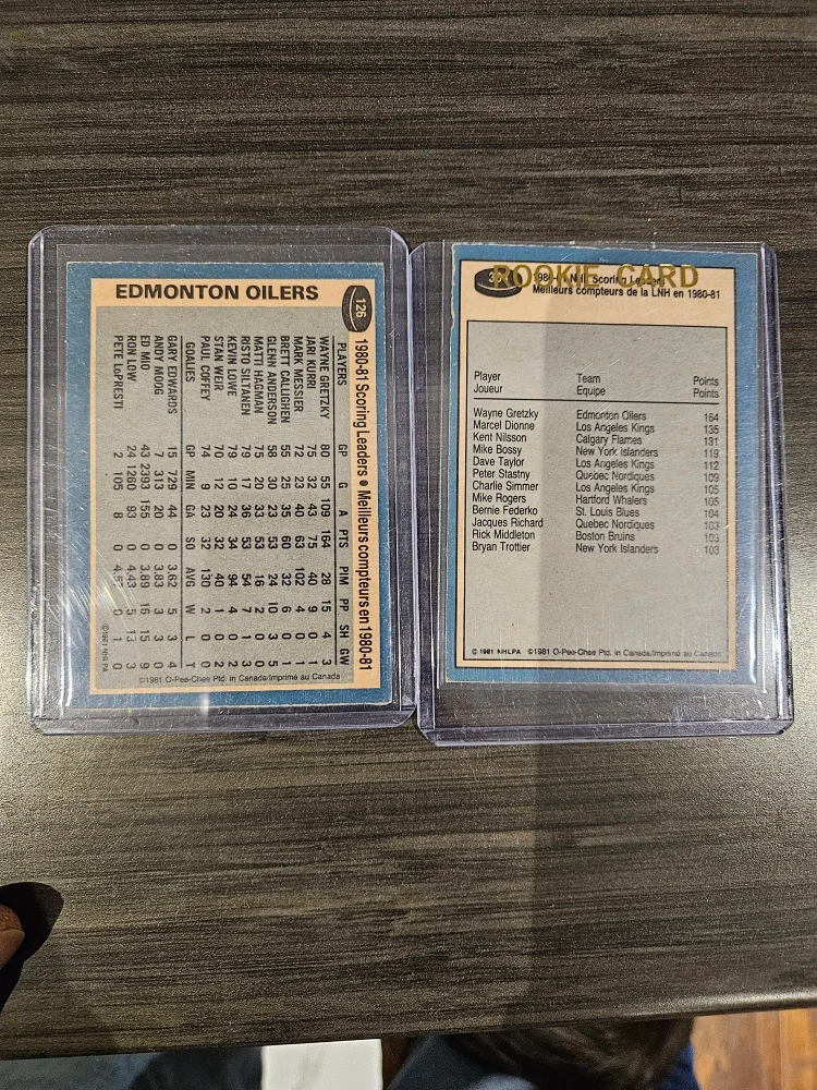 Selling a couple of Wayne Gretzky's 1980-81 O-Pee-Chee hockey cards. One is the NHL Scoring Leader card, and the other features Gretzky in action with the Edmonton Oilers. Great for any hockey fan or card collector!