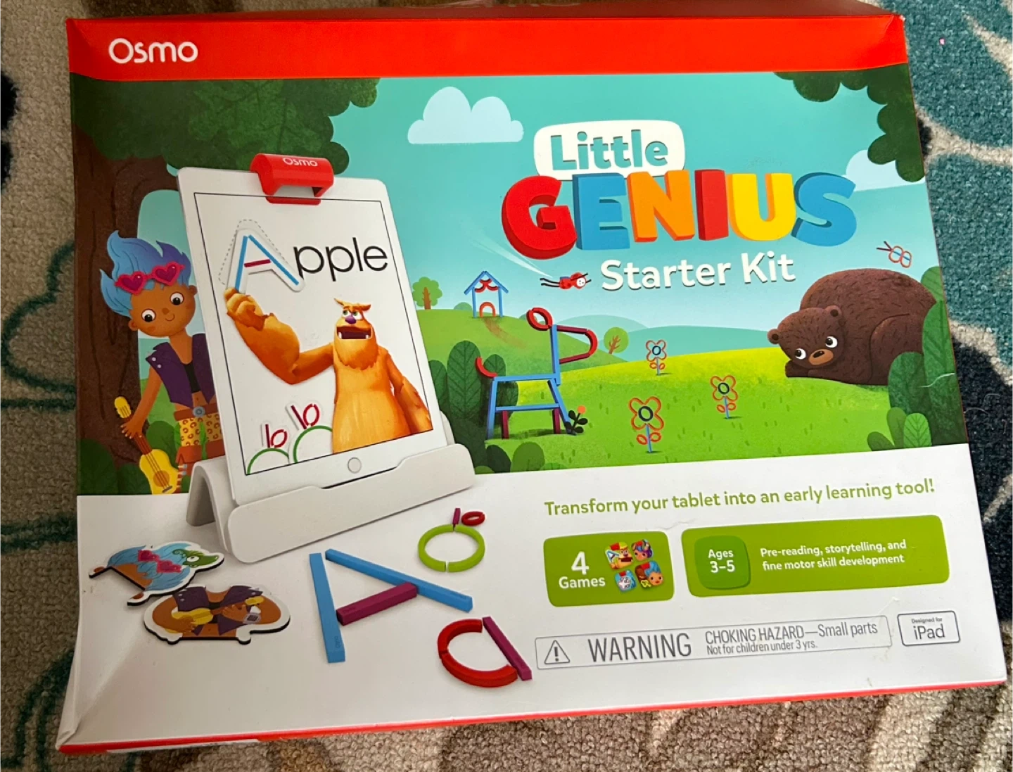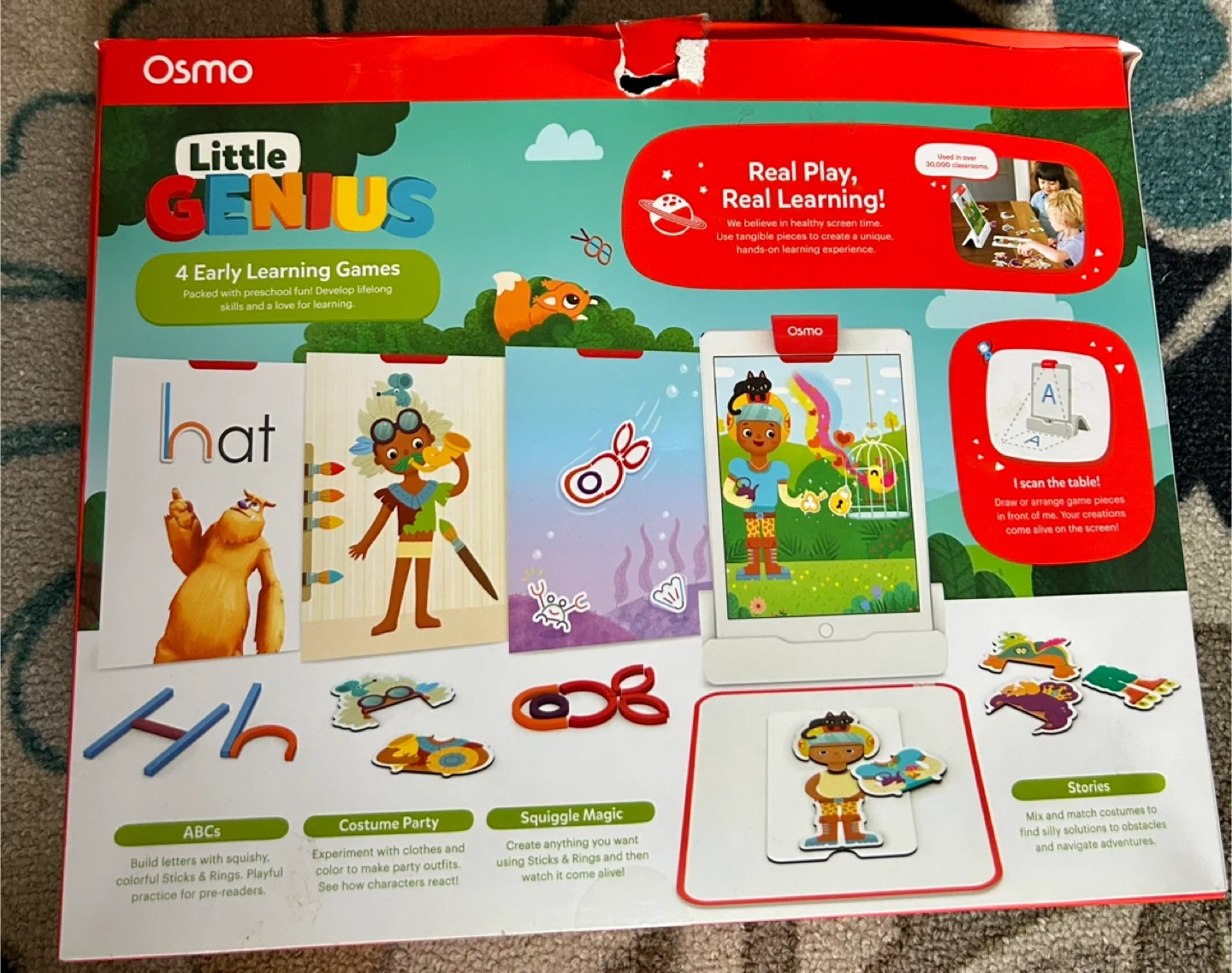 This is an Osmo gently used Little Genius Starter Kit for ages 3-5. It has 4 early learning games packed with preschool fun! It helps develop lifelong skills and a flow for learning.