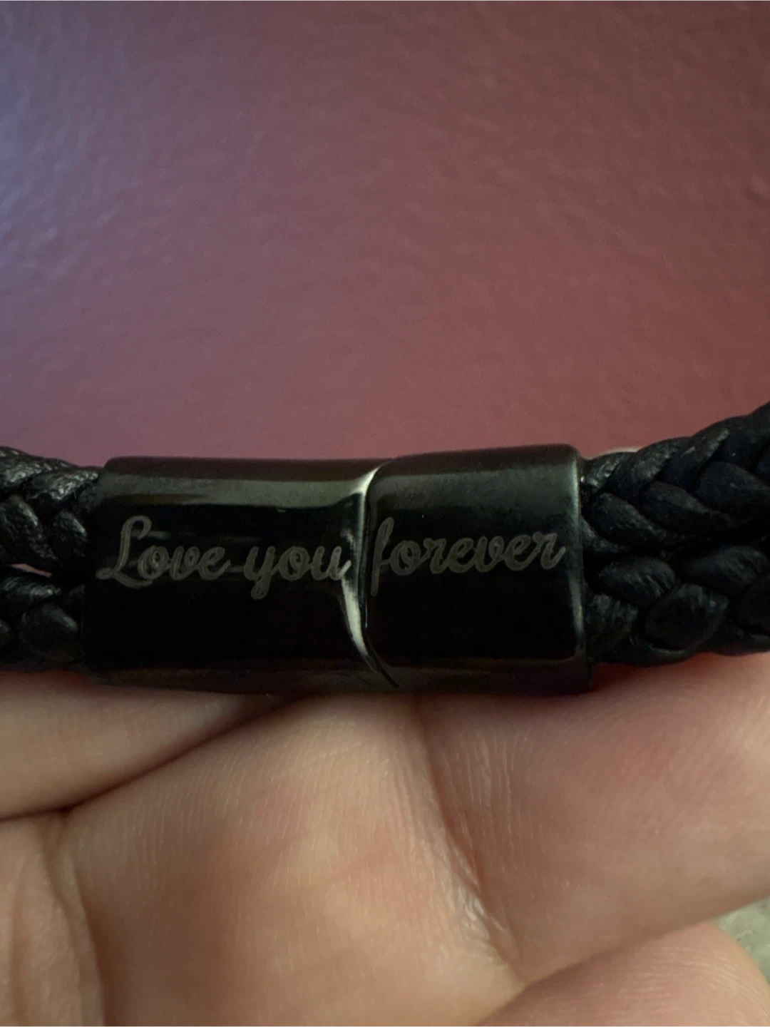 This is a genuine black braided leather bracelet. It has silver and gold colored accents. The clasp says 'Love you forever'. New with Box