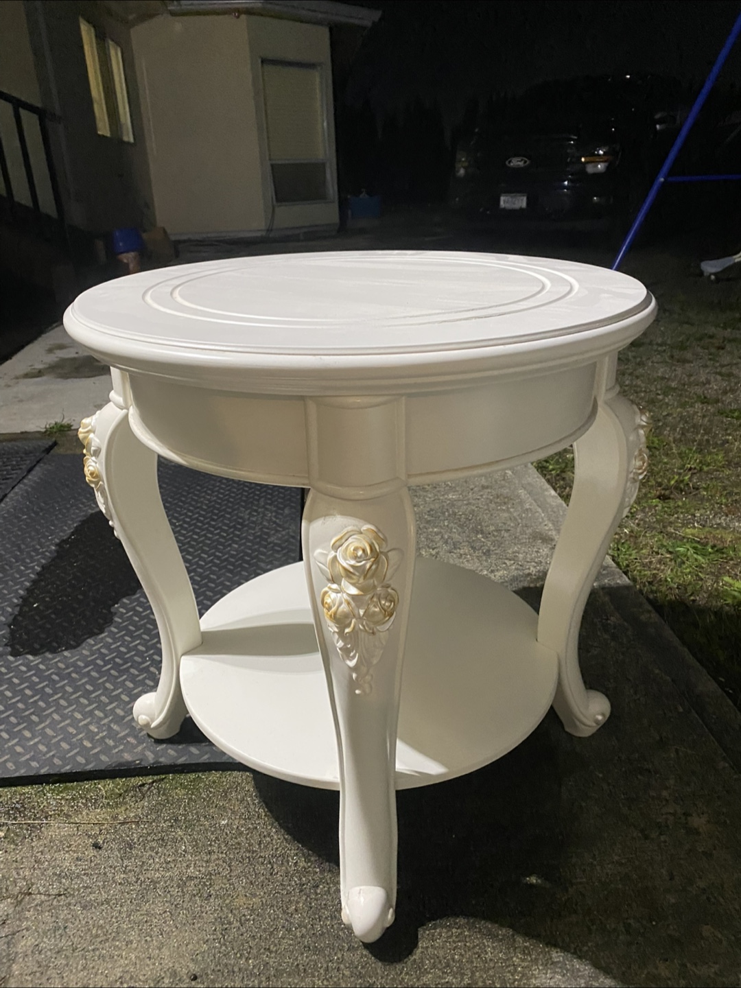 Selling a lovely round accent table! It's white with a classic design, featuring elegant curved legs and a lower shelf for extra storage or display. It's in great shape and would look great in any living room or bedroom