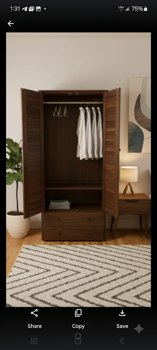 Selling a lovely brown wardrobe. It features louvered doors and two drawers at the bottom for extra storage. A great addition to any bedroom or closet space!