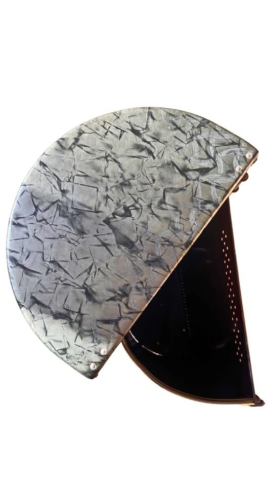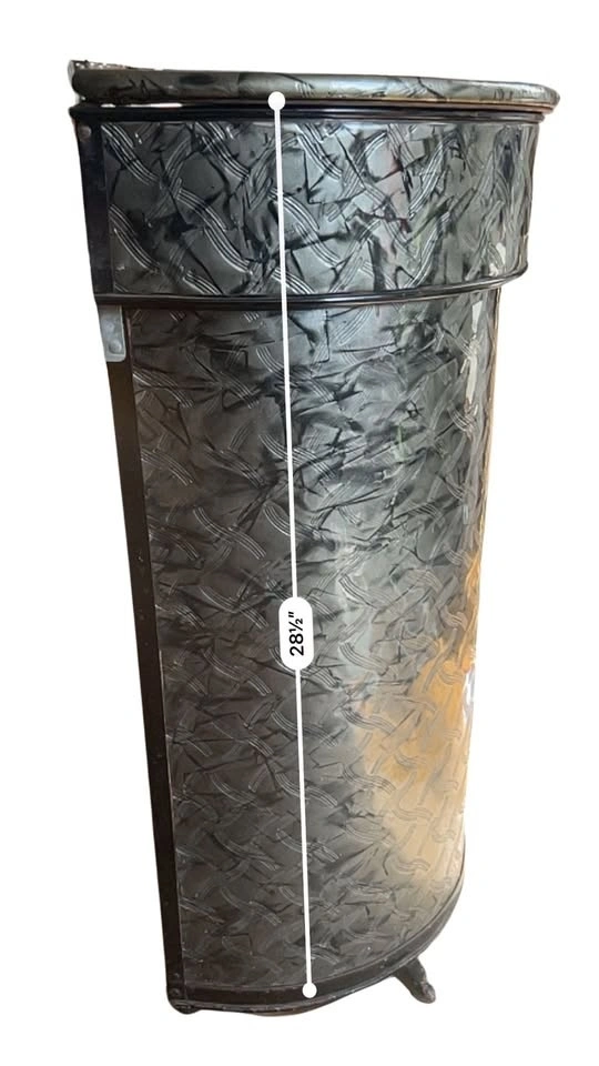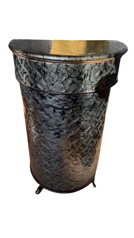 This is one of the most unique and beautiful pieces we’ve seen! It is a c1950s vintage clothes hamper with a super convenient delicates compartment on top. Beautifully embossed vinyl on front and lid covering a black metal frame with a metallic charcoal | black shiny finish, embossed detailing that creates a truly retro look.