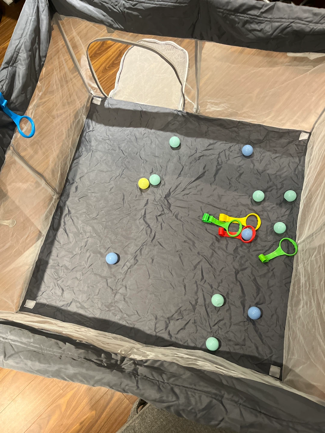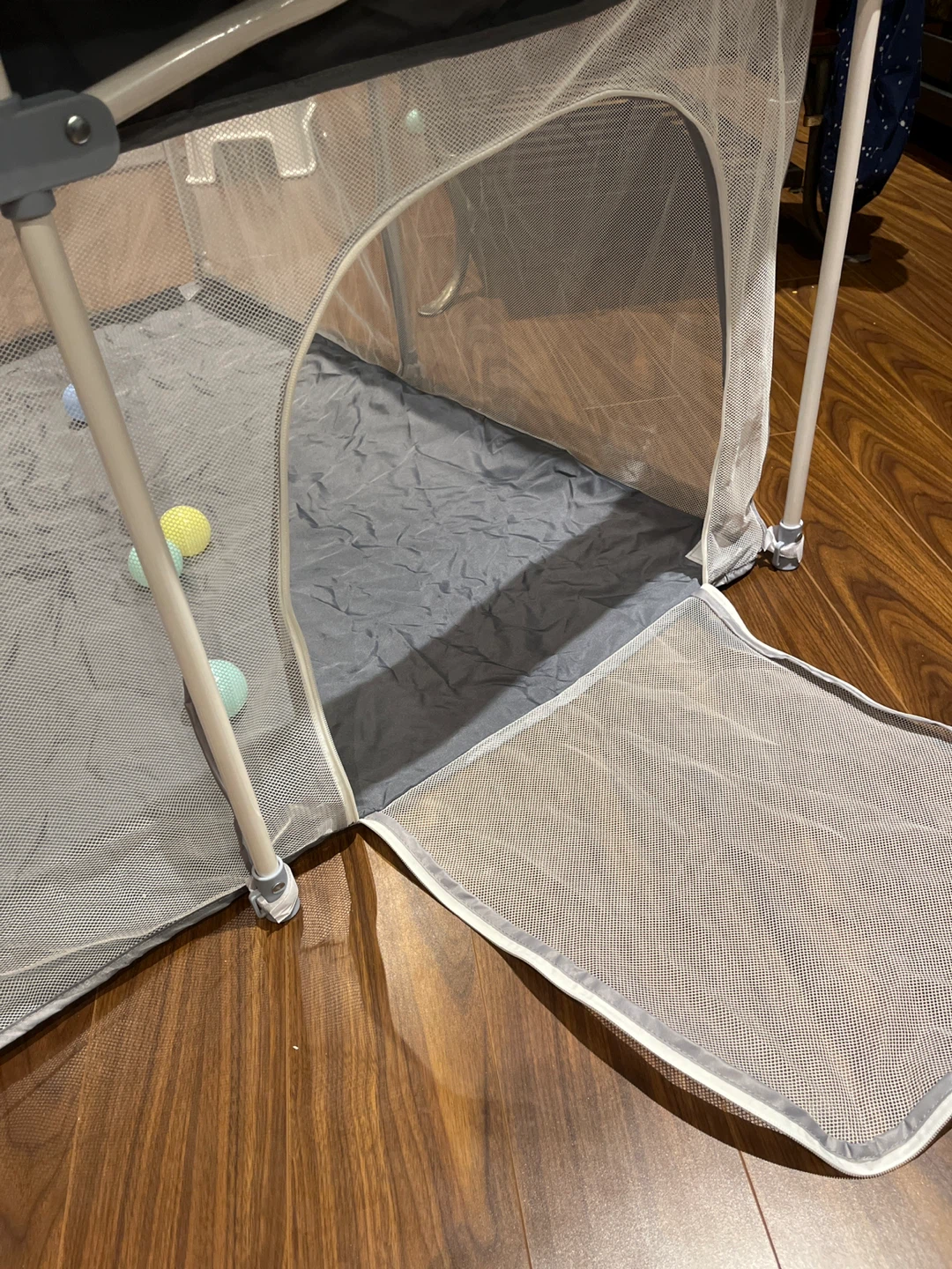 Selling a portable baby playpen 4F by 4F in great condition! It's perfect for keeping your little one entertained, whether you're at home or on the go. The playpen is easy to set up and take down, and it comes with a convenient carrying bag for storage and transport. Includes some play balls and toys! ** the zipper on the opening the door is broken/ missing **
