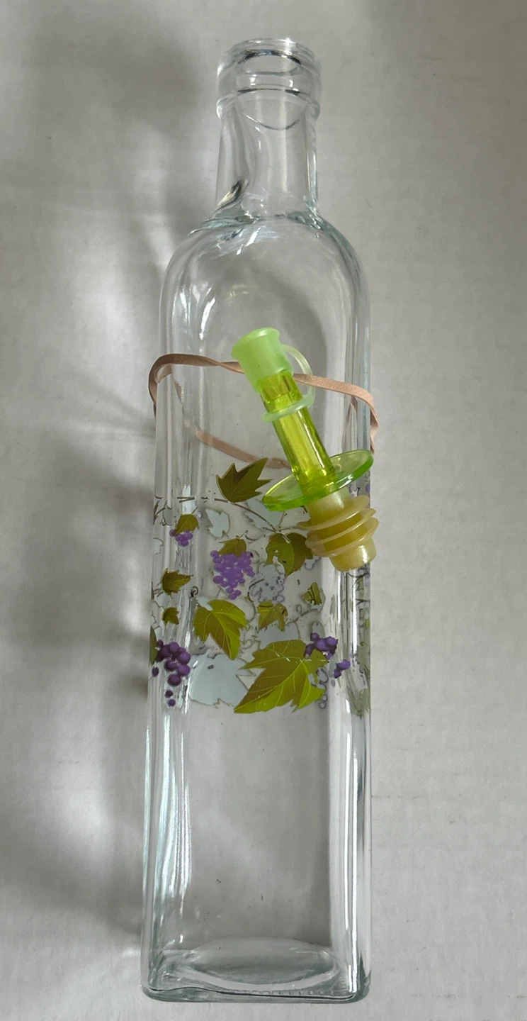 Giving away a clear glass olive oil dispenser bottle. It has a green spout and a grape design on the side. The bottle is about 10 inches tall.