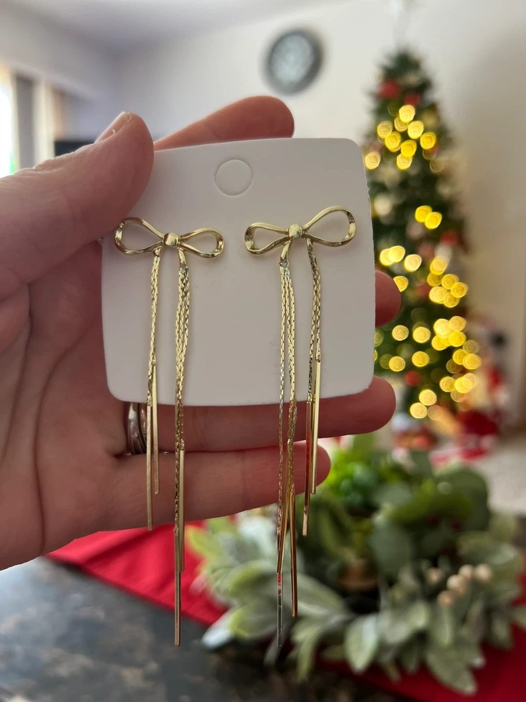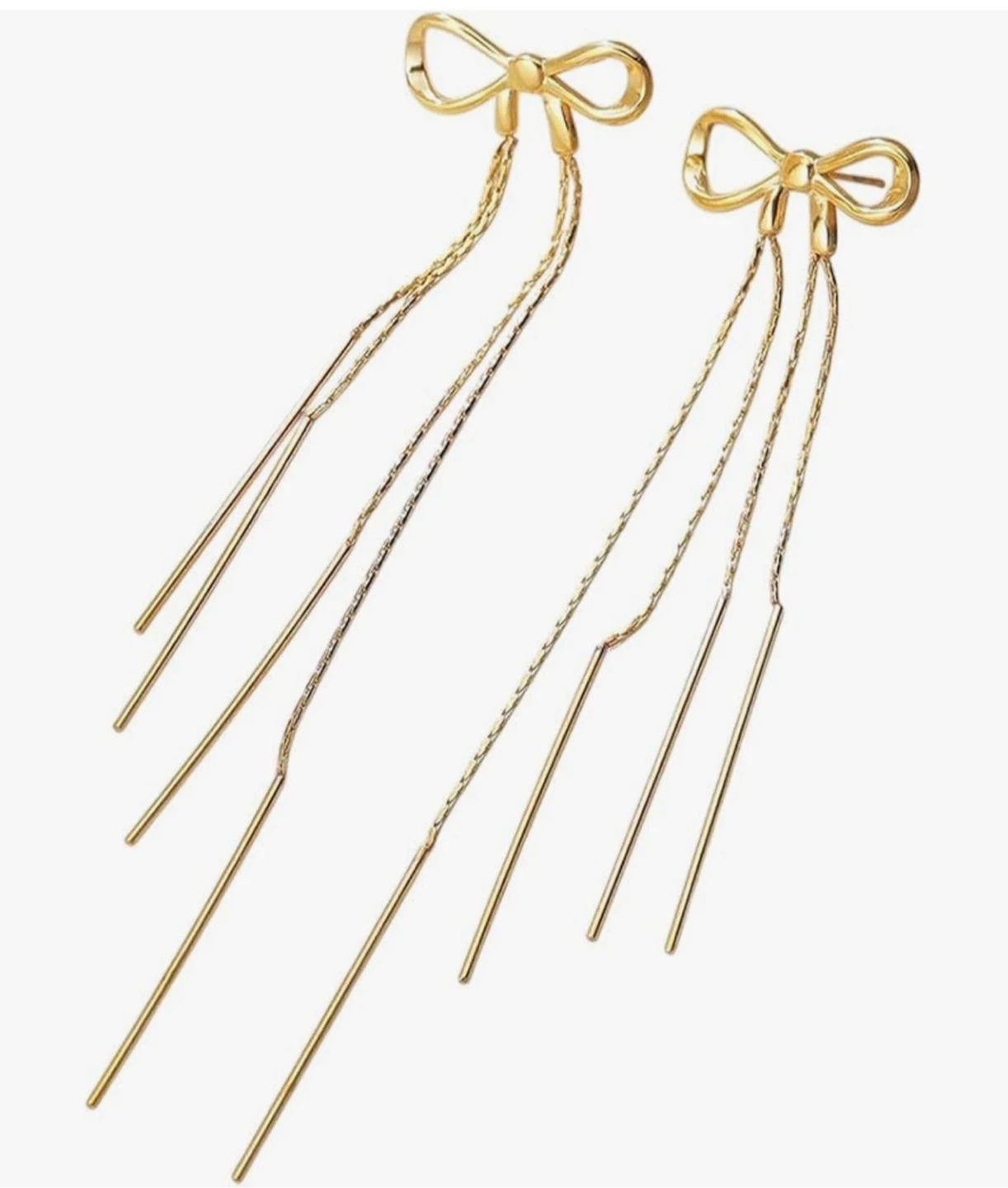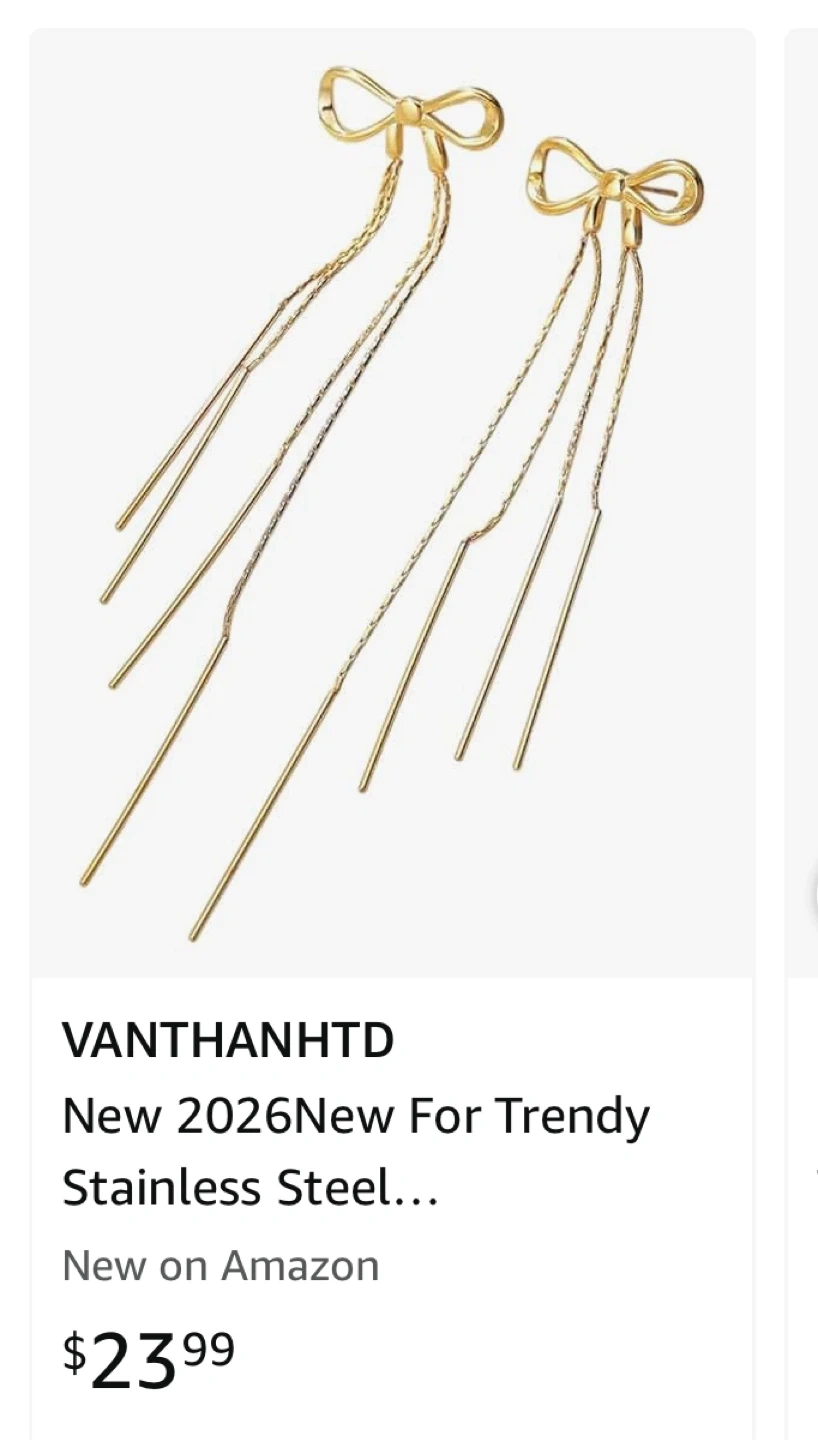 These are a pair of gold bow dangle earrings from VANTHANHTD. They are brand new and feature a trendy stainless steel design. These earrings originally retailed for $23.99