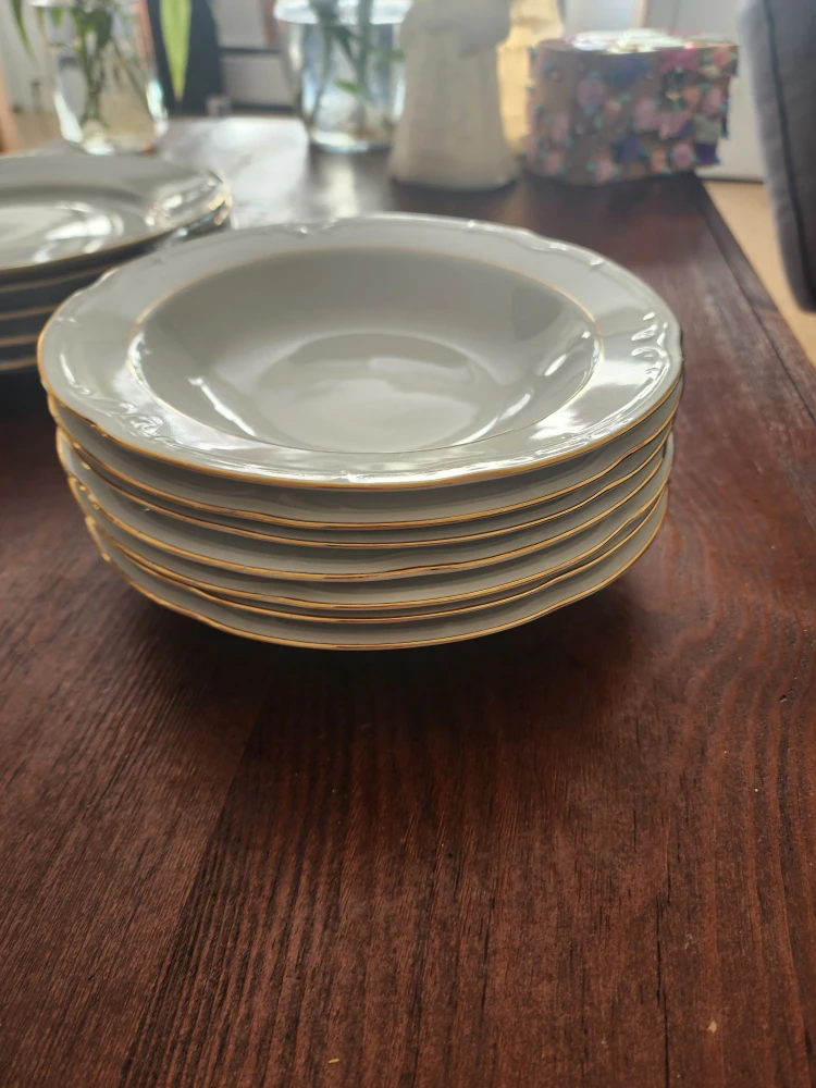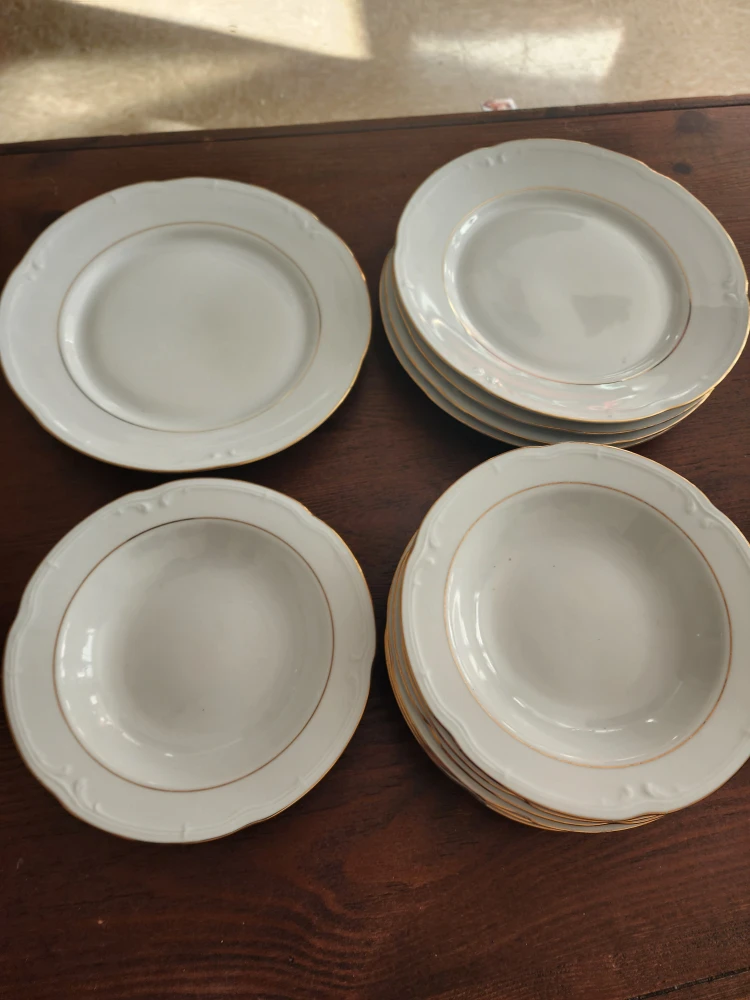Vendo un juego de 12 platos blancos con ribete dorado. Tienen un diseño clásico y elegante que quedará genial en cualquier mesa. Perfectos para el día a día o para ocasiones especiales. Están en buen estado.son 7 pequeños y 5 grandes