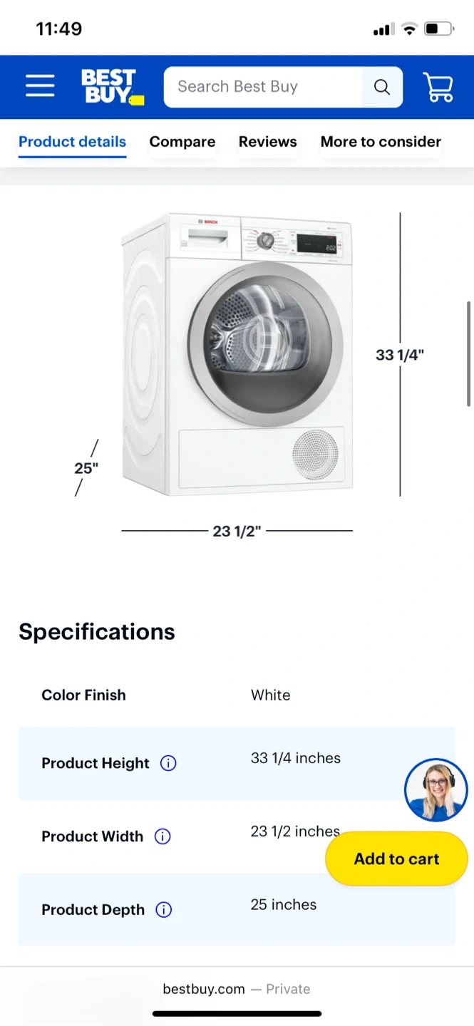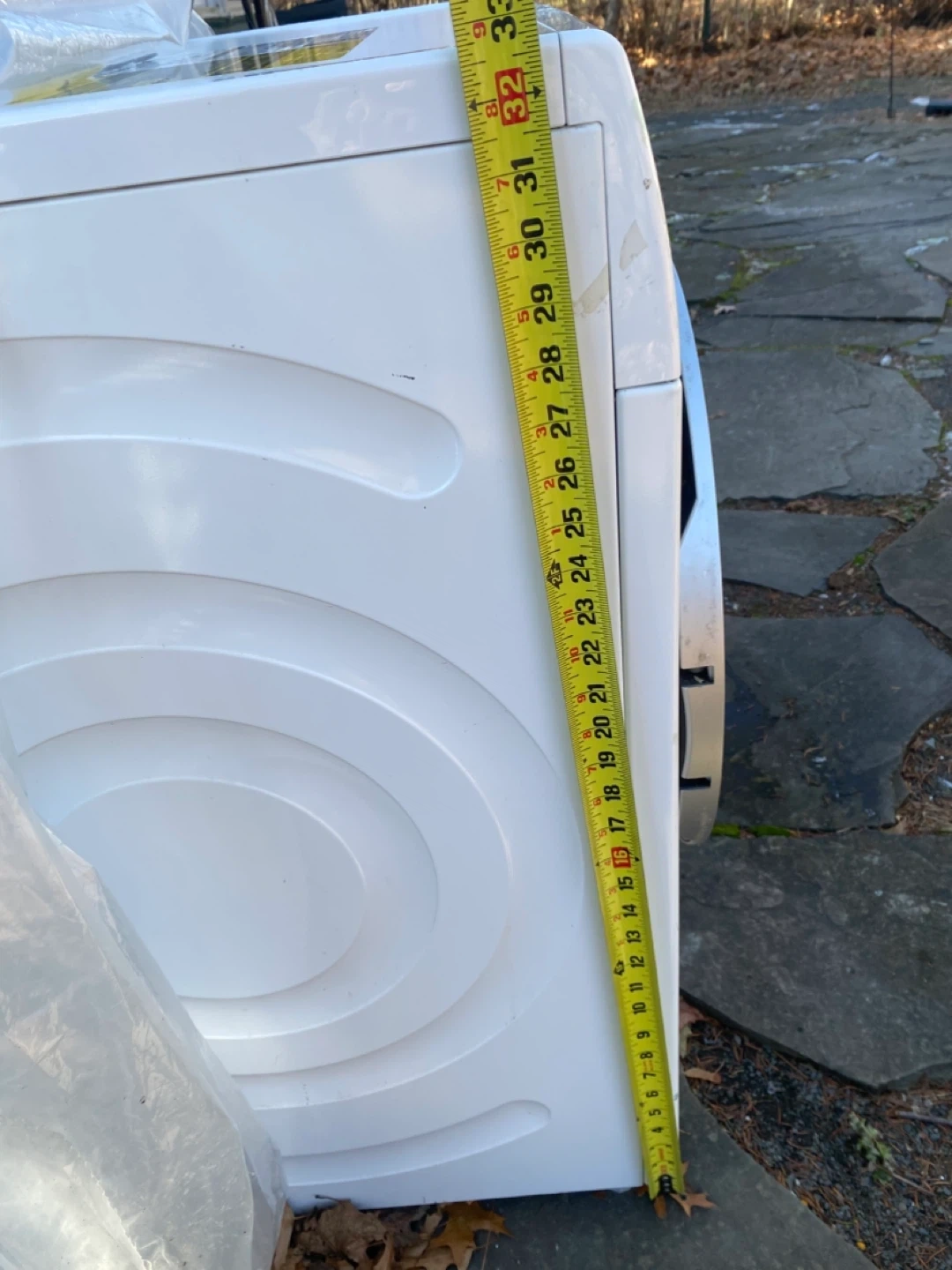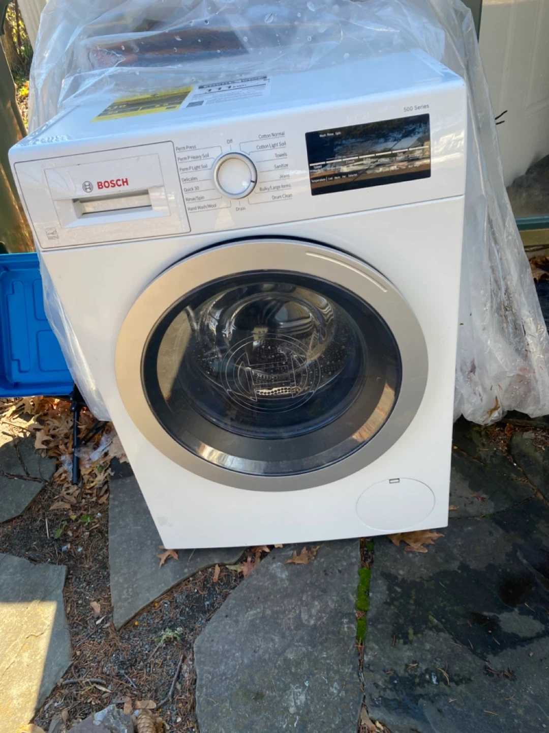 Selling a Bosch 500 Series washing machine in white. It measures approximately 33 1/4 inches in height, 23 1/2 inches in width, and 25 inches in depth. This model offers various wash cycles including Perm Press, Cotton Normal, and a quick 30-minute option