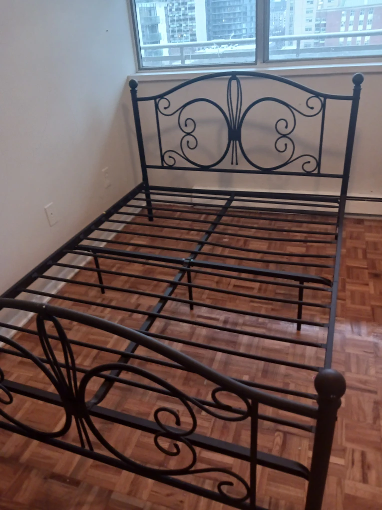 Selling a black metal bed frame, perfect for a full or double size mattress! It has a lovely design on the headboard and footboard. It's in great condition and ready for a new home.