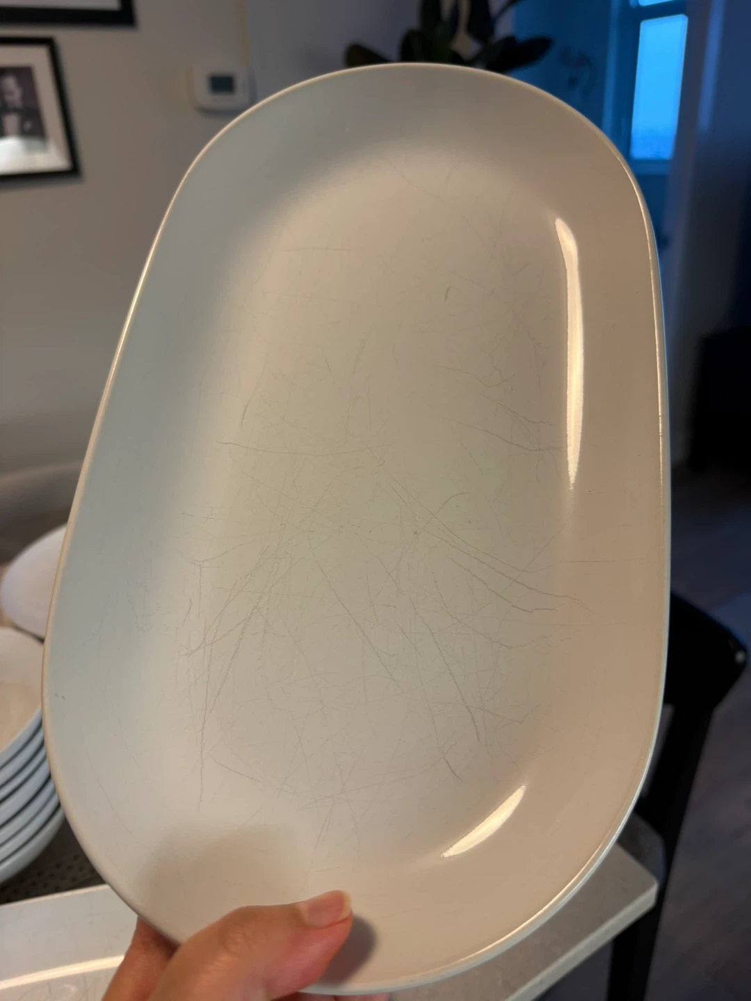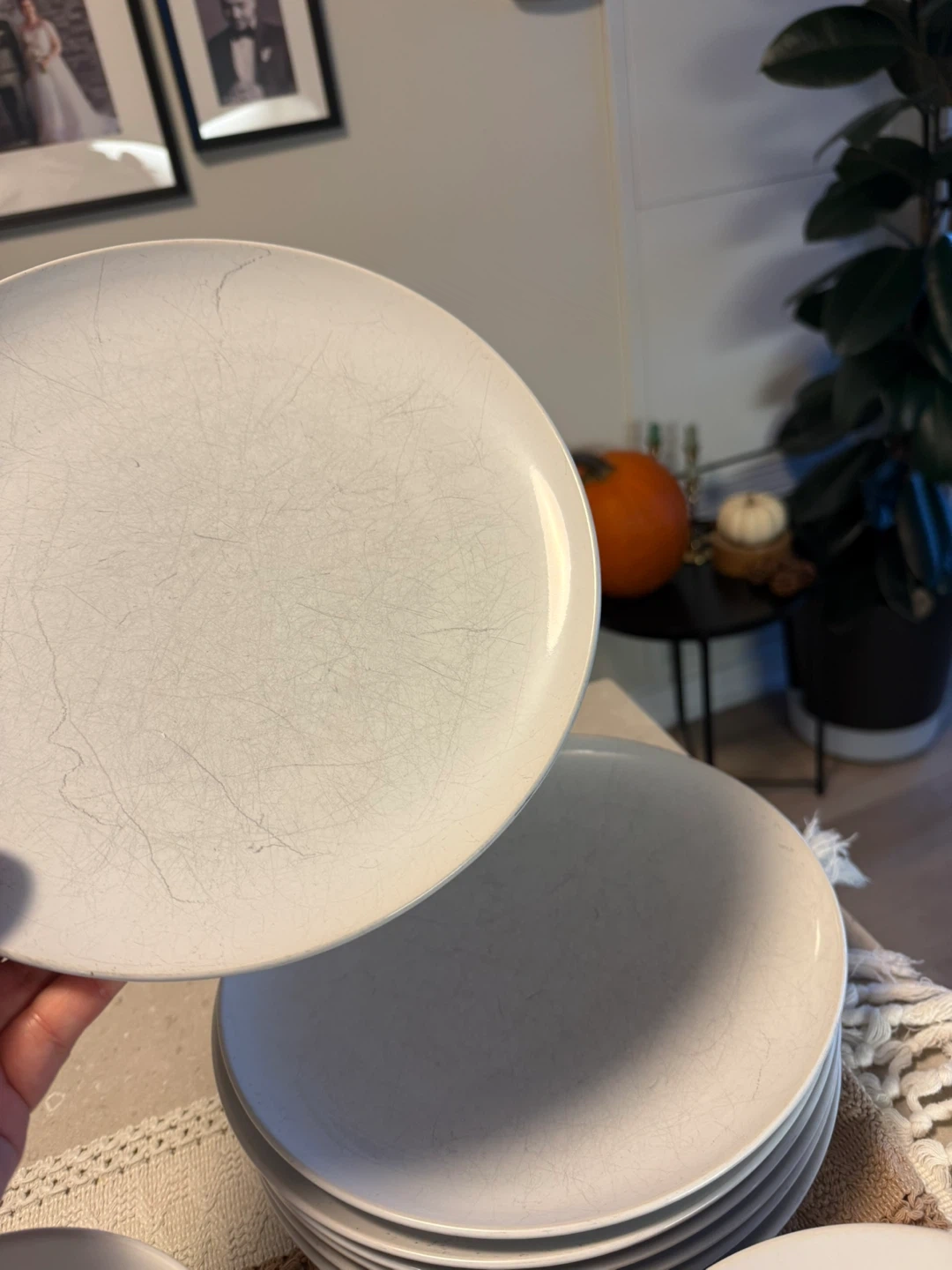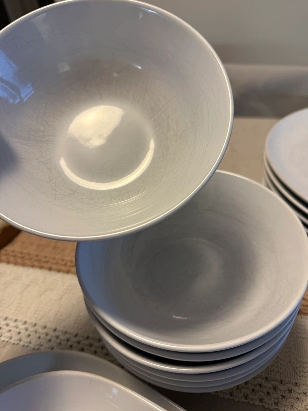 Selling a set of white dinnerware, including plates and bowls. They have some scratches, but are still perfectly functional for everyday meals!