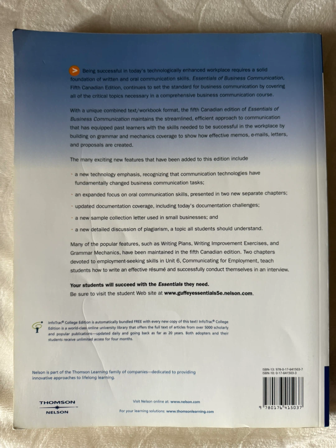 Selling the fifth Canadian edition of Essentials of Business Communication textbook. It's a combined text/workbook format that covers the essentials of business communication. Great for students!